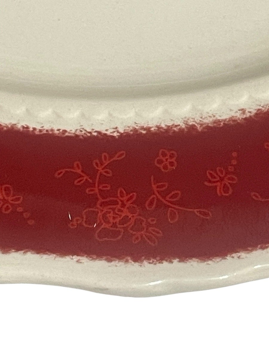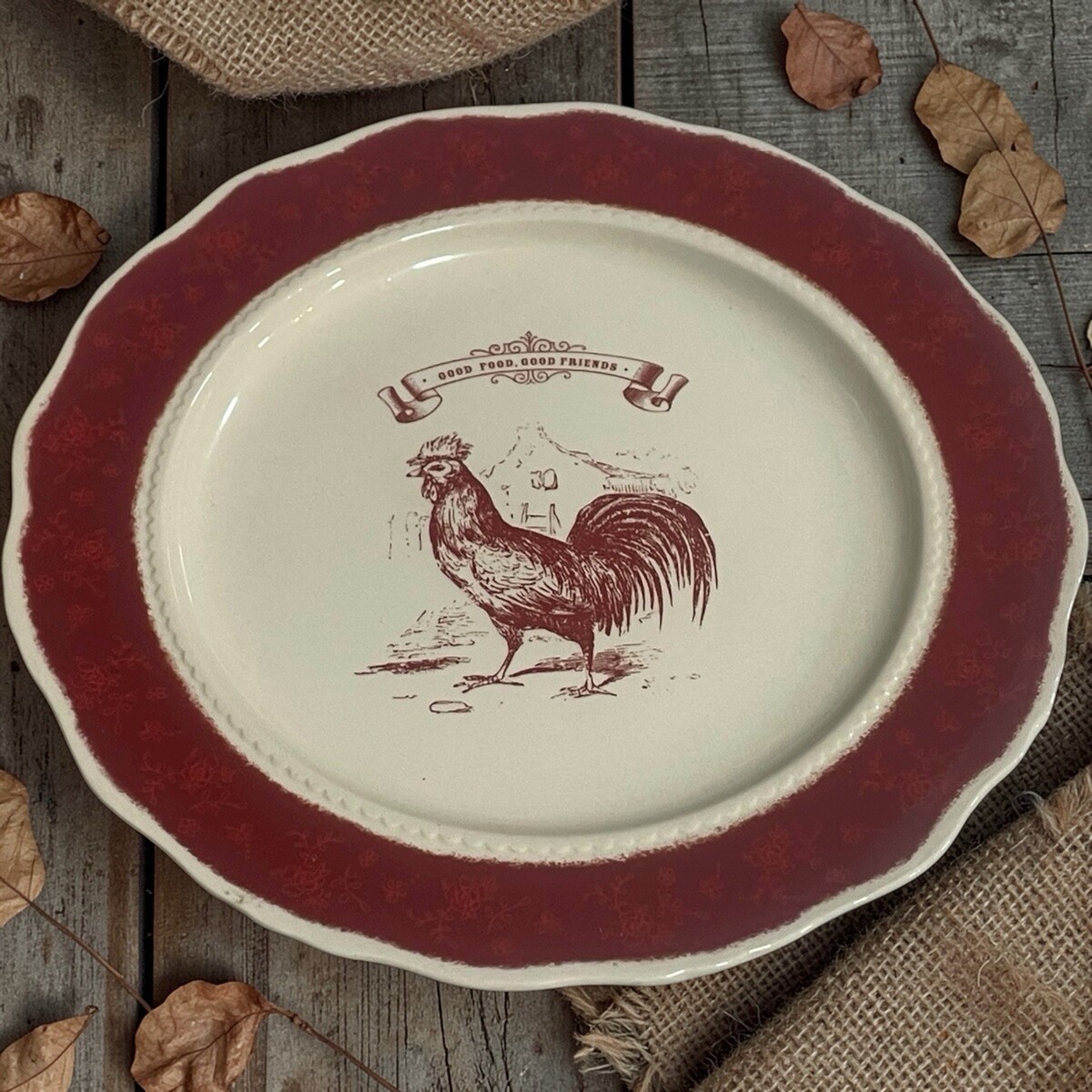 The Country Living "Good Food, Good Friends" 9" Salad Plate is a beautiful ceramic plate featuring a charming red "friends" pattern. Made in China, this set includes a single salad plate perfect for serving salads or desserts at any table setting. The vibrant red color adds a touch of warmth and whimsy to any dining experience, making it a delightful addition to your pottery and glass collection.