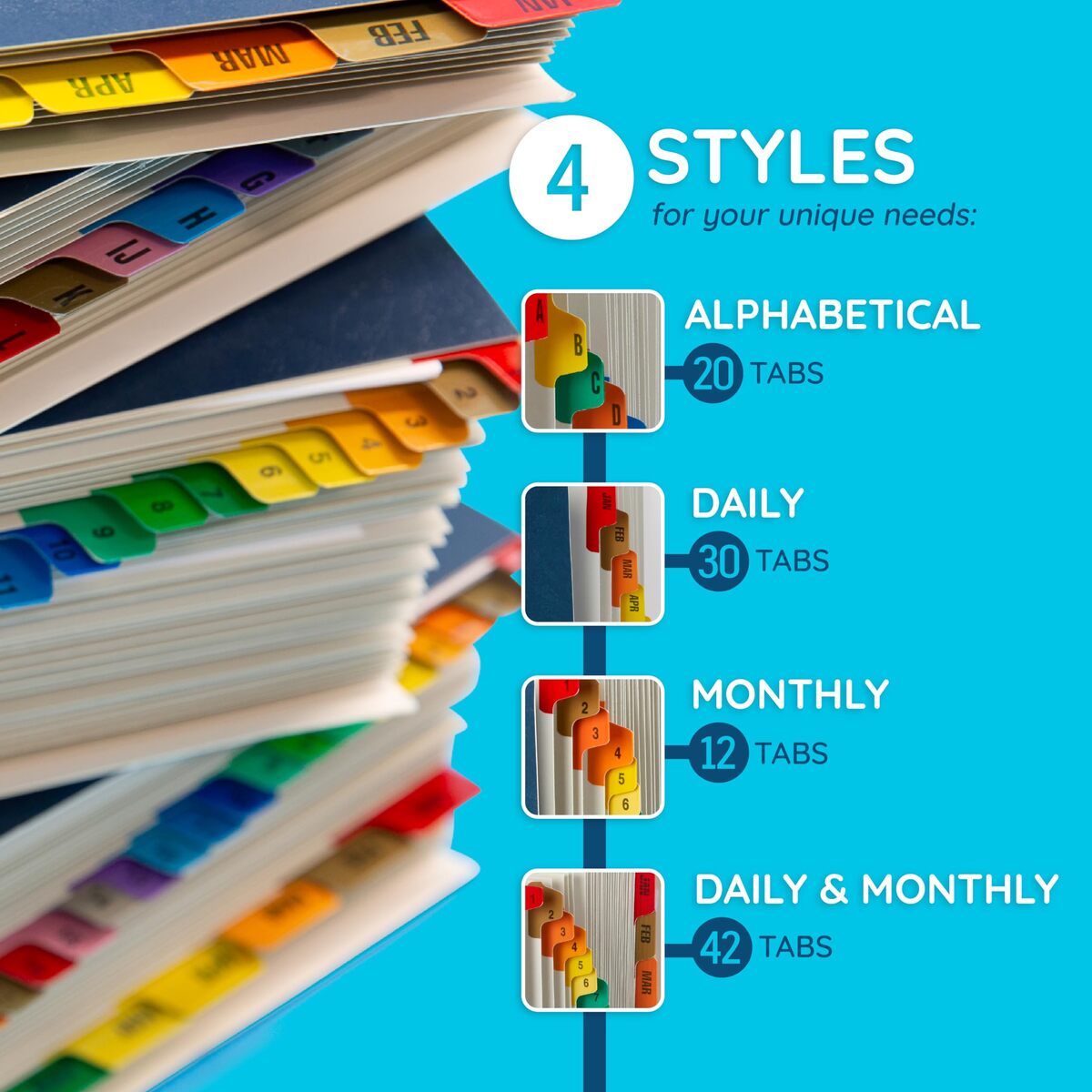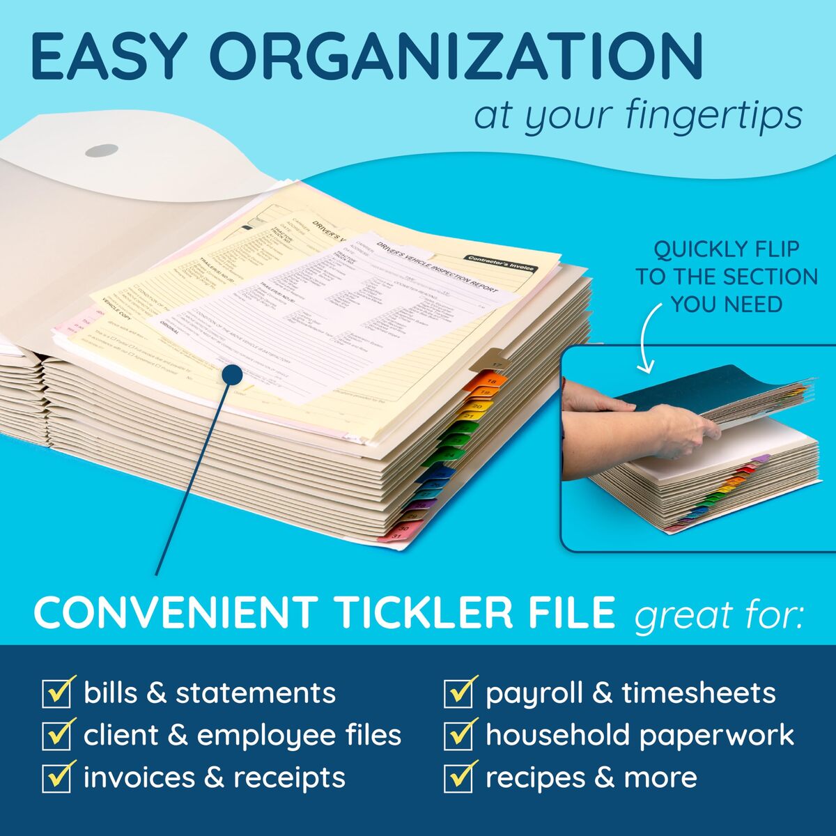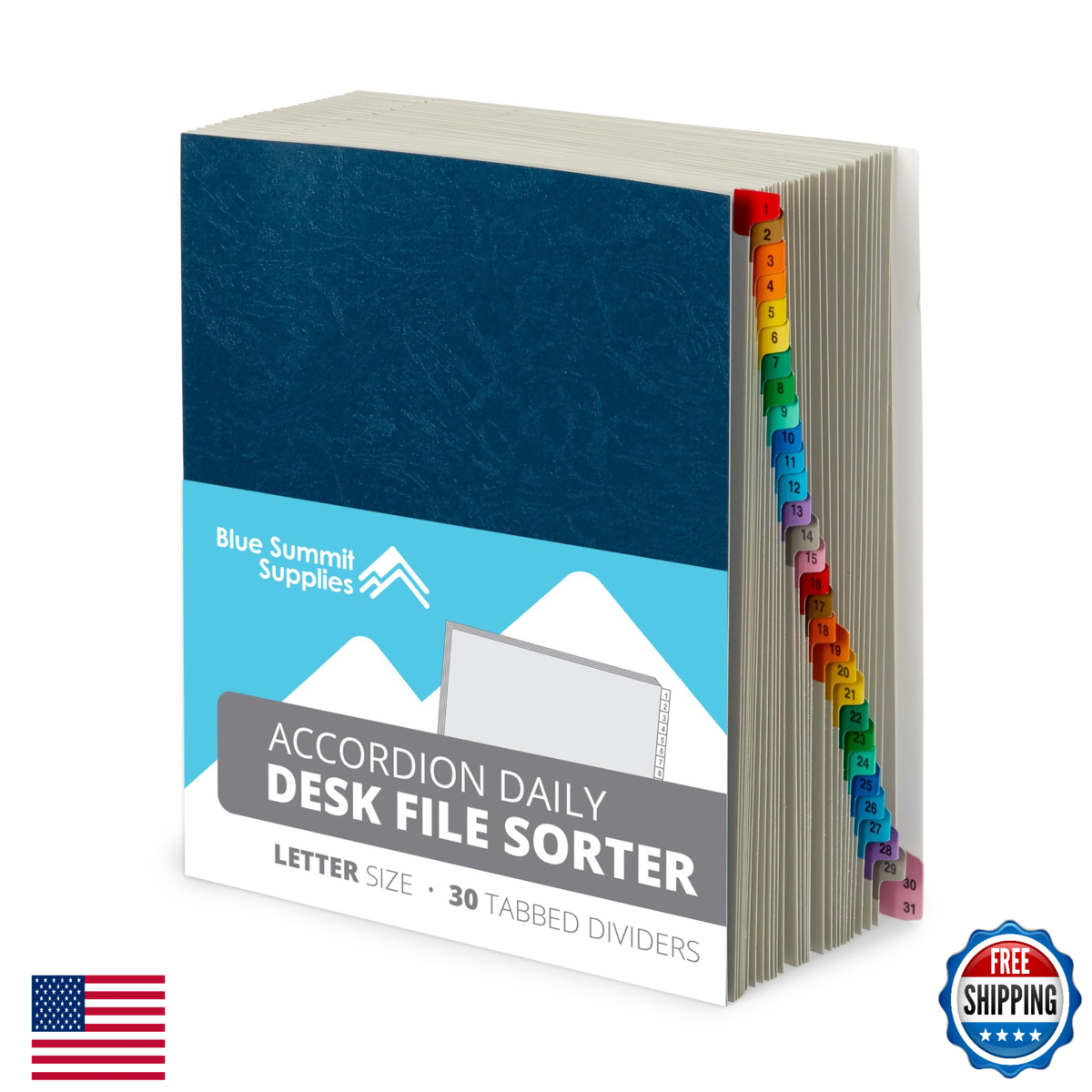 Organize with Ease ? This expanding desk file sorter organizer keeps bills, invoices, and documents neat, with 31 daily coated tabs (numbered 1?31, with 30/31 combined) and a reinforced accordion spine for durable daily use.,Daily File Organizer ? Multicolored 1?31 tabs make this daily file divider system ideal as a tickler file organizer for client files, employee records, receipts, or home office paperwork.,Expands to Hold More ? Letter-size desk file sorter expands to fit large volumes of paperwork, opening flat for quick access, making it the perfect desk sorter organizer for busy offices or home use.,Durable Desk File Book ? Built with reinforced accordion sides and sturdy daily file folder dividers, this desk file sorter organizer book 1?31 keeps papers secure while letting you check sections at a glance.,Versatile Paperwork Sorter ? From tax time to schoolwork, this daily accordion file organizer doubles as a portable document sorter strip or tickler file organizer to reduce clutter anywhere.