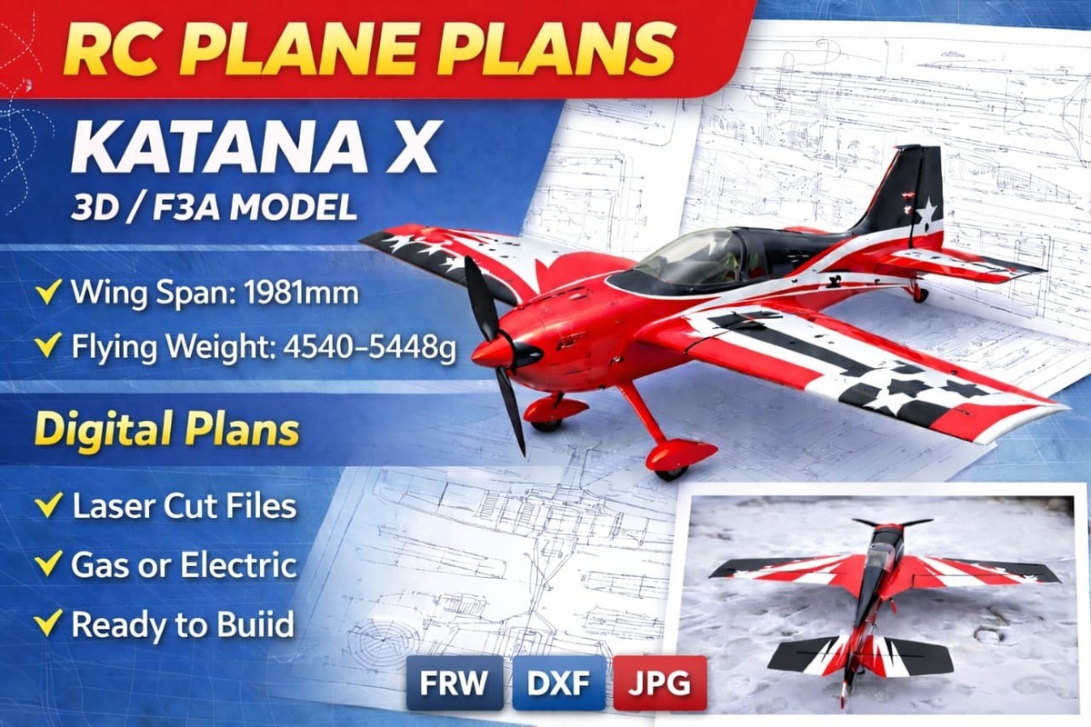 High-performance aerobatic model aircraft plans for the legendary KATANA X 3D / F3A RC airplane. Designed for builders who want extreme maneuverability, precision control, and professional-level aerobatics.