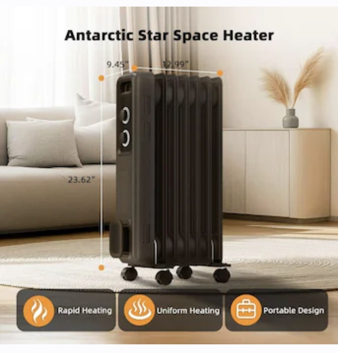 Oil Filled Radiator Heater, 1500W Electric Space Heater for Indoor Use, Portable