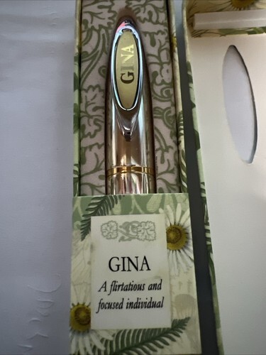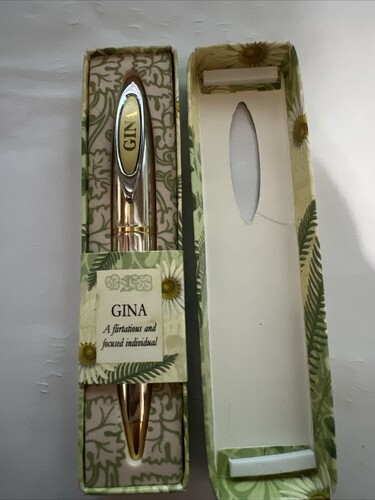 Signature Pen "GINA" - pen measures 4?. In a stationary Boxed Gift , Saying on the front ~ GINA A flirtatious and focused individual... Condition is "New". Pen writes black ink . Gold tone.. the box has a puncture mark on the back along with a couple sharpie marker lines to cover the writing on the box
