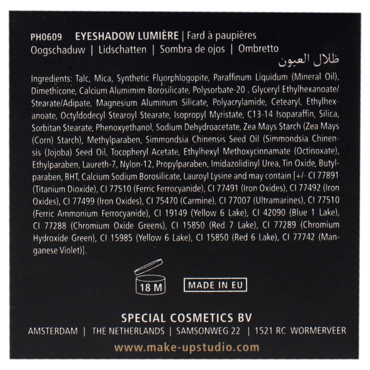 The eyeshadow lumire is a baked, highly pigmented eye shadow powder that can be applied both dry and wet. When you apply it with moisture it will become even more intense in color. Very suitable as shade, highlight or in the inner corner of the eye for an extra sparkling glance. Stays on place for a long time.