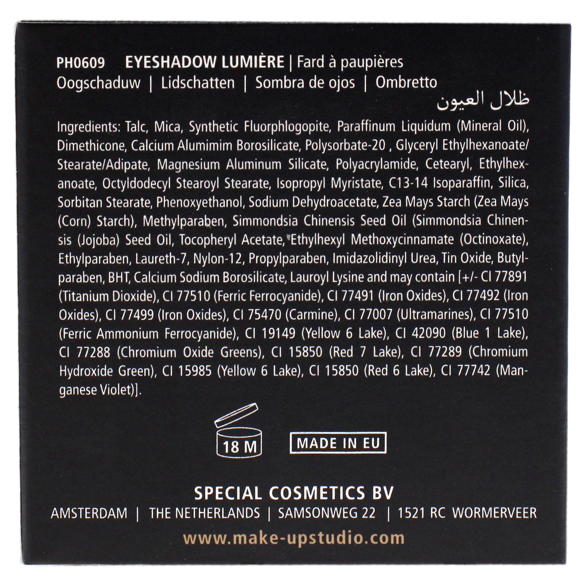 The eyeshadow lumire is a baked, highly pigmented eye shadow powder that can be applied both dry and wet. When you apply it with moisture it will become even more intense in color. Very suitable as shade, highlight or in the inner corner of the eye for an extra sparkling glance. Stays on place for a long time.