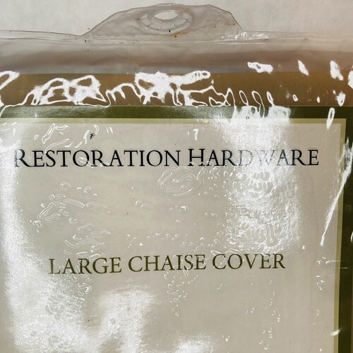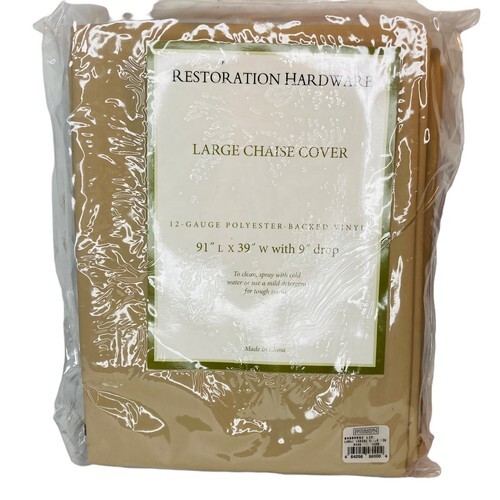 Restoration Hardware Tan Linen heavy 12 gauge polyester backed vinyl cover for outdoor patio/pool/deck chaise lounges chair. Measurements are 91? long by 39? wide with a 9? drop. Spray clean with cold water or mild detergent.