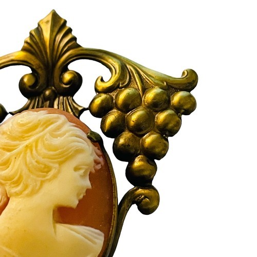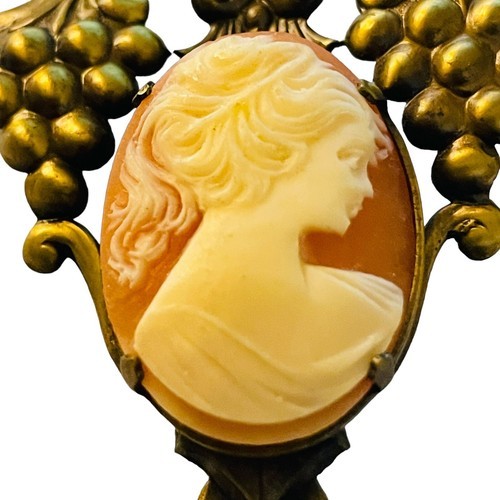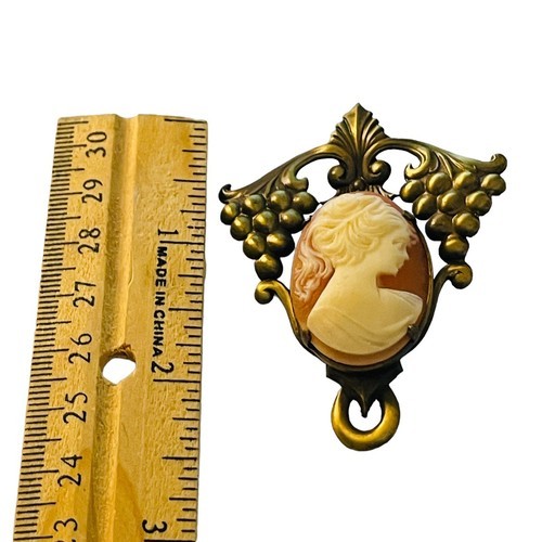 The Bakelite material, bronze metal, and bronze main stone color make this brooch a fashion statement piece. The seller does not provide a warranty, and its country of origin is unknown. The brooch is not customized, but it has attractive features like the cameo and grapes design. This Cameo brand brooch can be a great addition to any jewelry collection.