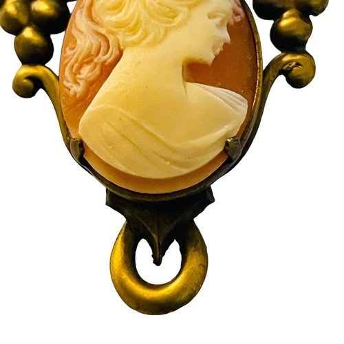 This Art Nouveau brooch features a beautifully carved coral cameo of a lady with a ponytail and grapes, set in bronze. The oval shape and prong setting style add to its unique appeal. The brooch is pre-owned, but its vintage charm will surely make a great gift for Mother's Day or birthday.