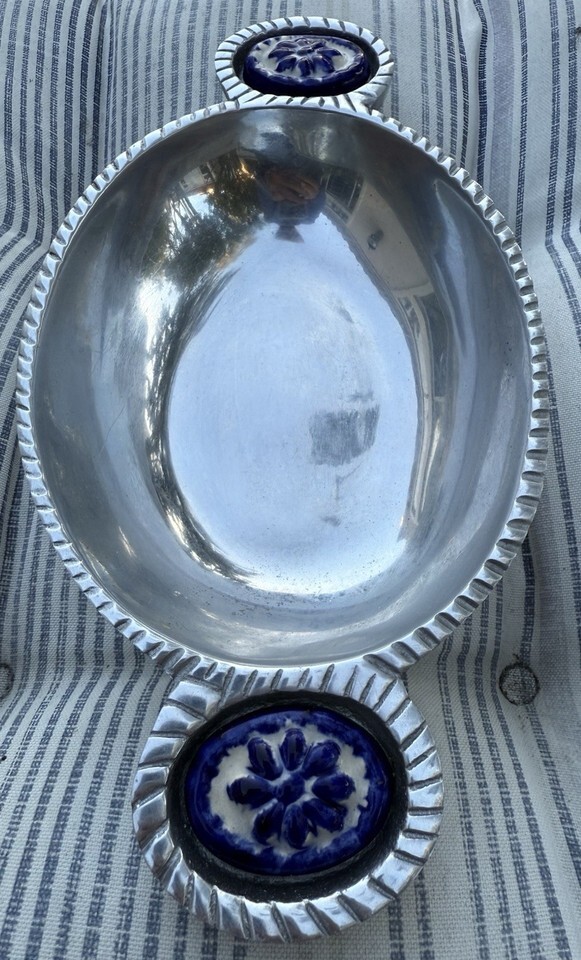 Holland Boone Polished Pewter Oblong Bowl With Ceramic Decorative Handles