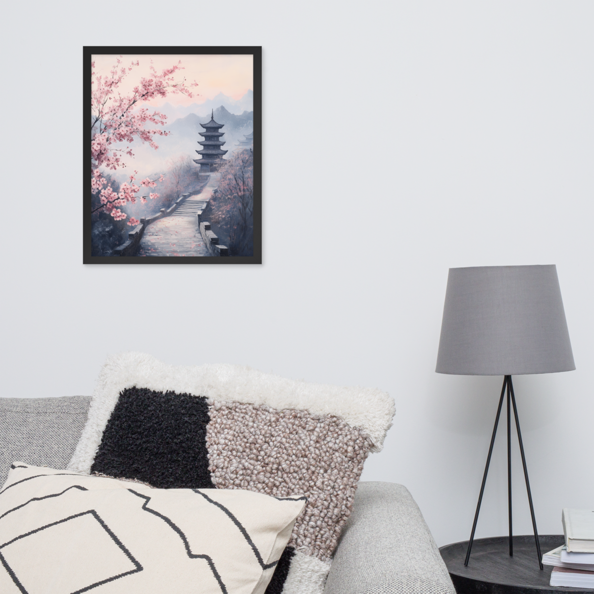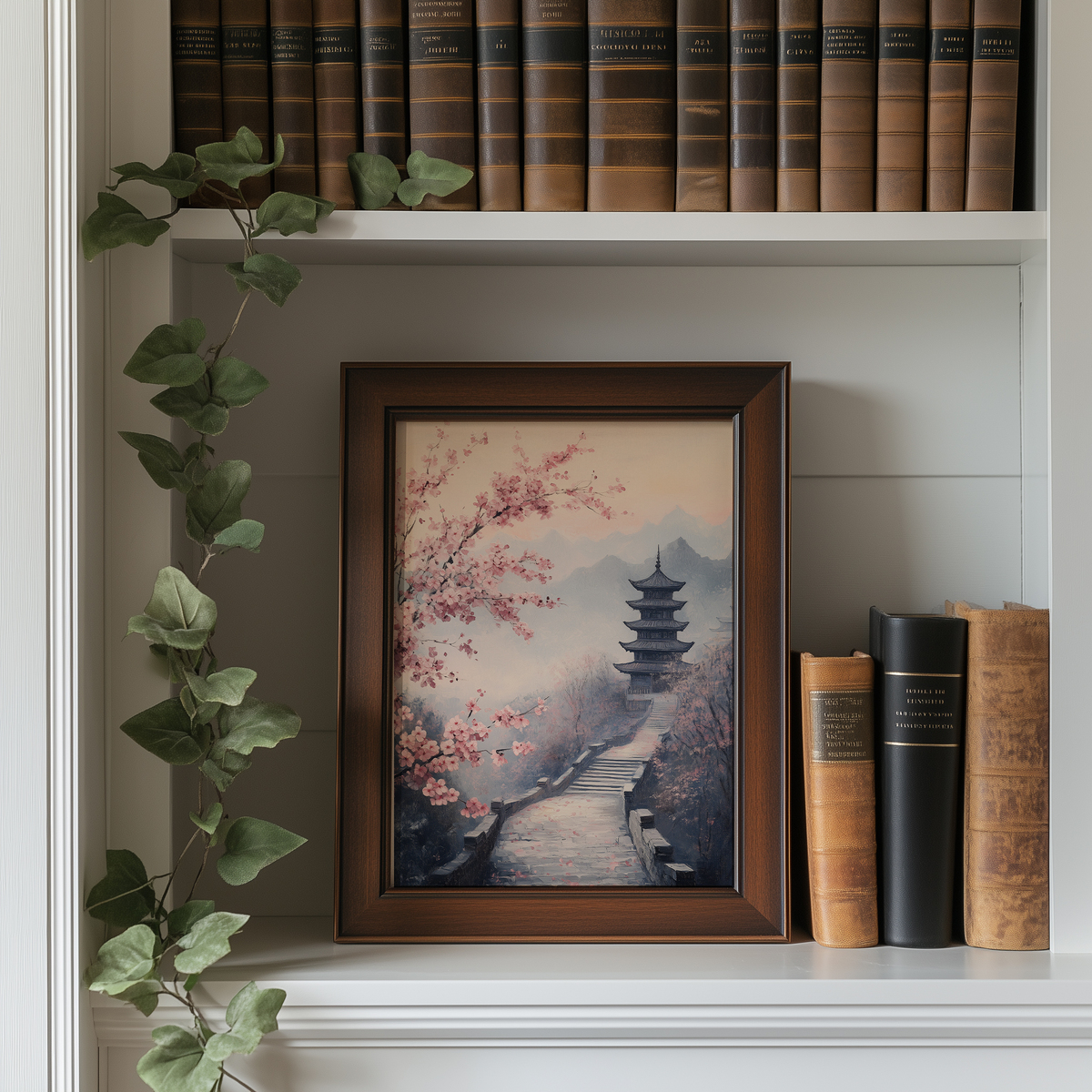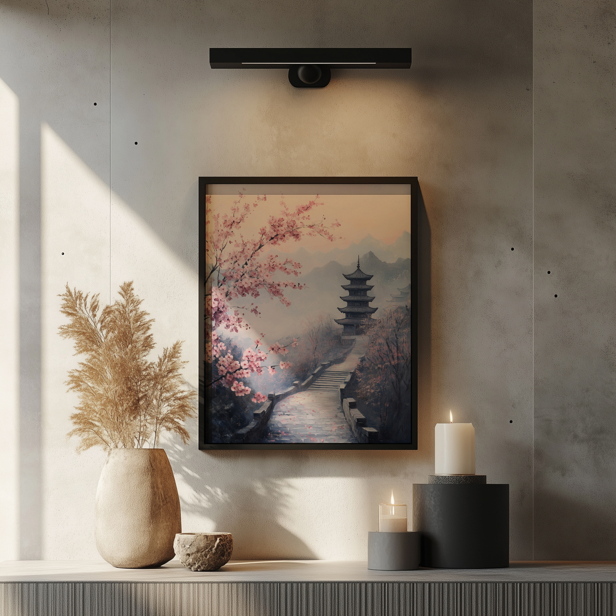 Oil Painting Serene East Asian Landscape with Pink Cherry Blossoms - Printable Moody Wall Art, Tranquil Pagoda Scene, Pastel Spring Decor