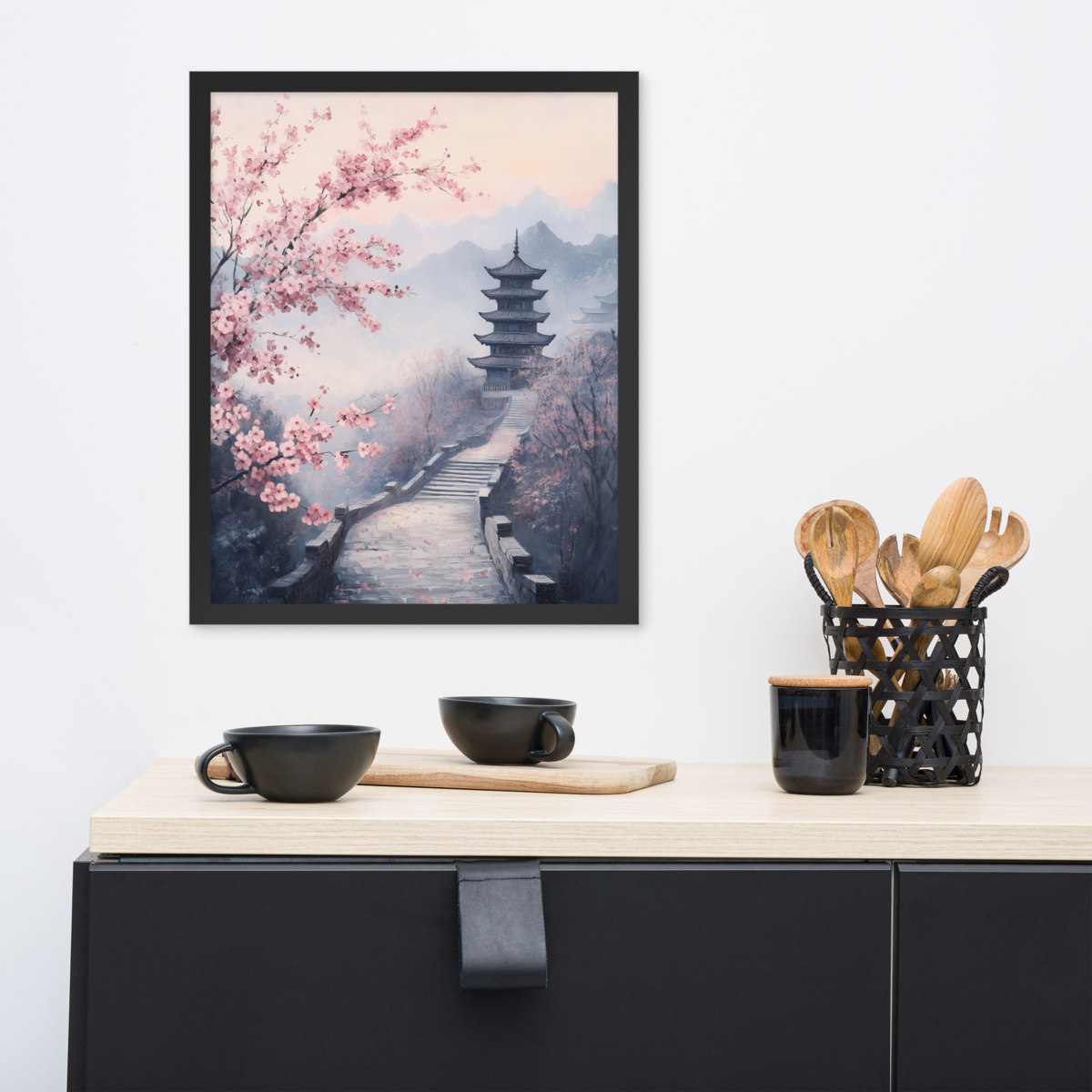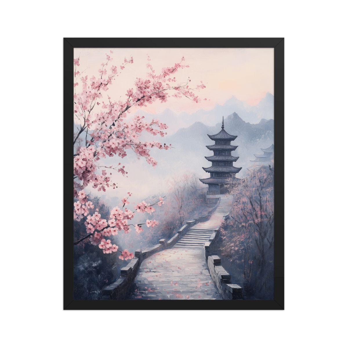 Oil Painting Serene East Asian Landscape - Pink Cherry Blossoms Wall Art