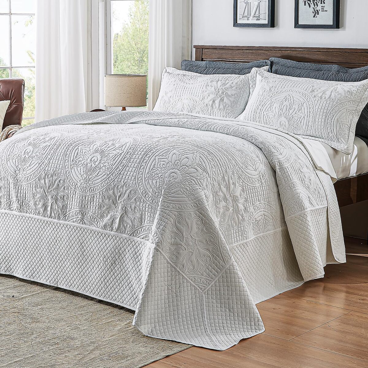 Oversized King Bedspread: This california king quilt is designed for larger and taller king-size beds, thick mattress beds, and split adjustable beds. It ensures the coverlets reach all the way to the floor, eliminating the need for a dust ruffle bed skirt,Quilting Vintage Pattern: Crafted with ultrasonic quilting technology for durability and a seamless finish, and a pet-friendly design. The cal king quilt draws inspiration from traditional Persian patterns. This design exudes a vintage elegance that will enhance creativity and aesthetic appeal in your bedroom,Soft and Lightweight: The white quilt bedspread both sides are made of premium softest Microfiber, and the filling is 130 gsm 100% Polyester; The texture is slightly brushed, soft and warm which perfect for all season. Versatile as a main bedspread or layering piece,What You Can Get: The oversized king bed spread coverlet set includes 1 extra large king quilt 120" x 120", and 2 matching shams 20" x 36", accommodating large pillows comfortably. NOTE: 3 sizes available, please measure the bed and mattress to choose the appropriate size,Easy Maintenance Vacuum Packaging: These extra wide oversized king quilts is machine washable, gently in cold water, tumble dry on low. Vacuum-packed to ensure cleanliness and ease of handling. Please allow some time for the bedspread to fully expand, you can enjoy the ultimate softness, warmth