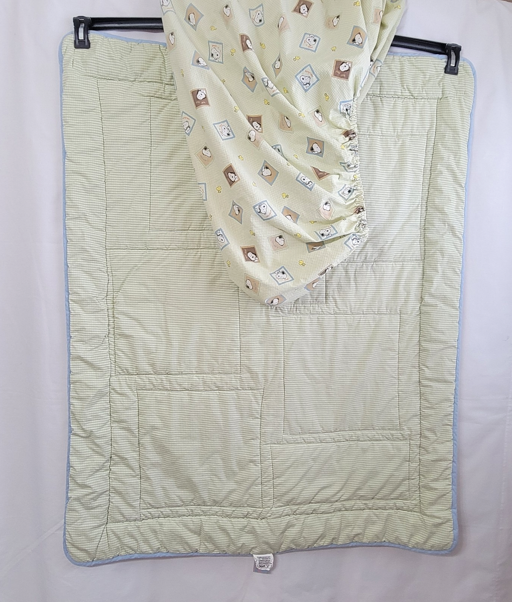 Vtg Baby Snoopy Peek a Boo Crib Quilt + Sheet Neutral Colors Green Beige Cream