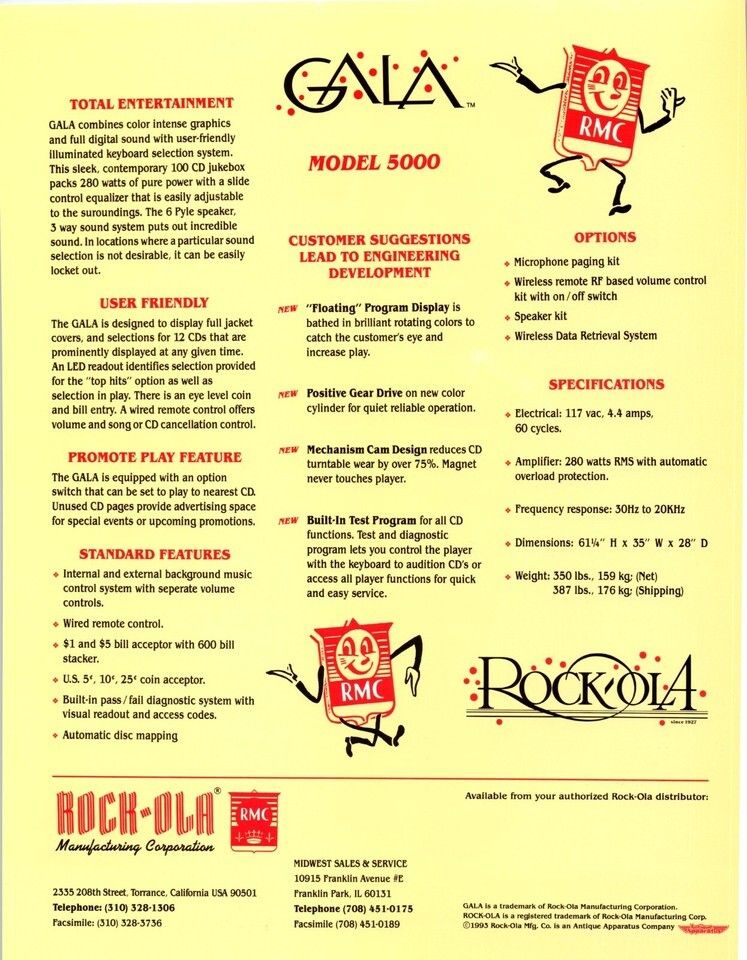 RockOla Gala 5000 Jukebox FLYER 1993 Unused and 16 similar items