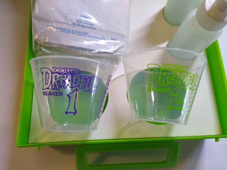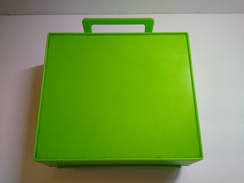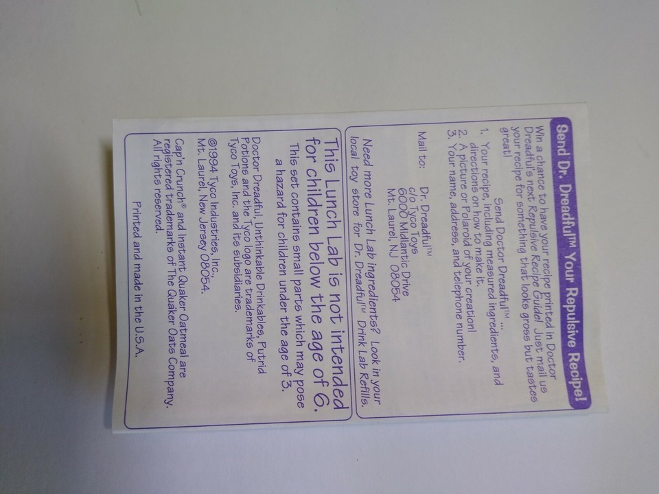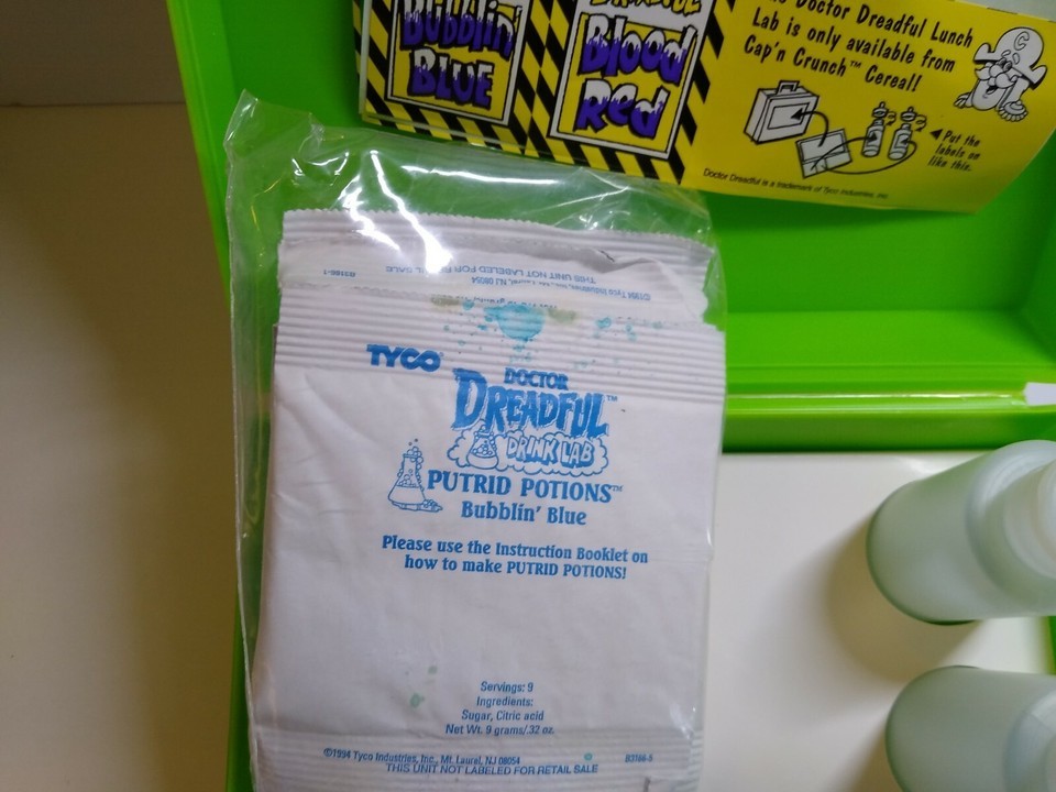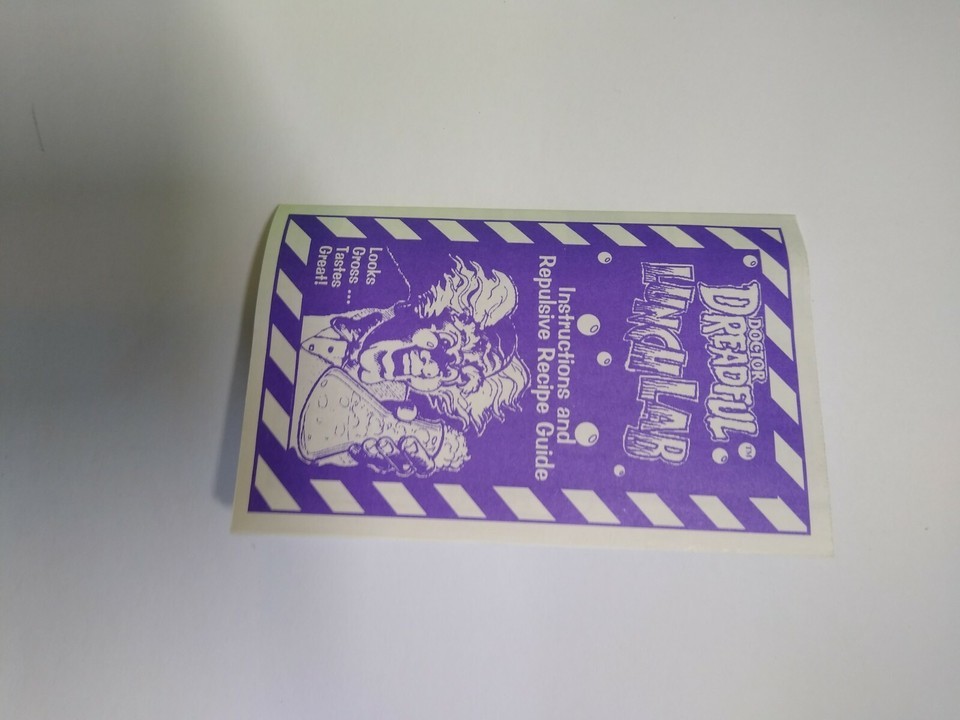 New old stock rare find. A Doctor Dreadful Lunch Box or Lunch Lab. Tyco is printed on the front graphic decal. Full contents and never used. A promo item from Cap'n Crunch cereal back in 1994. Complete with green plastic box, 4 packets of the putrid potions, instruction recipe guide booklet, extra decals, two plastic bottles with toppers, and two plastic beaker cups title #1 and #2. The plastic box latches do not close very well due to the poor design. Some stains to the packets of drink potions. Front decal has some edge wear. Size of box is 7.5" x 6.5" x 3.25". See photos.