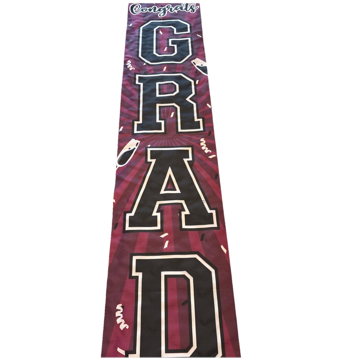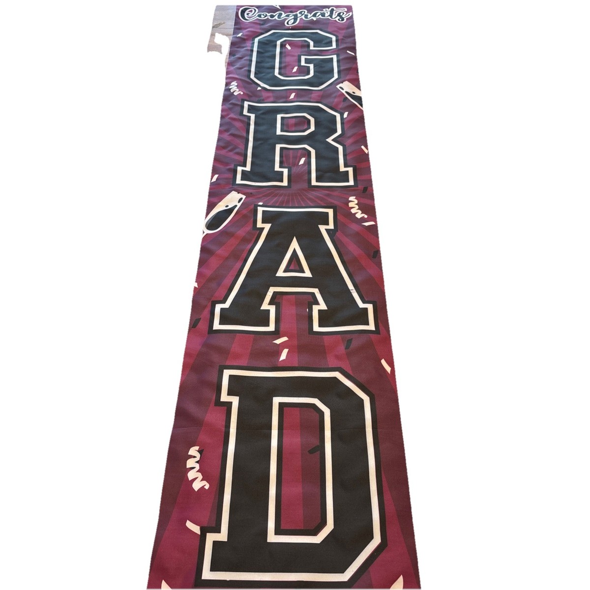 Celebrate new graduates with this maroon graduation flag/banner set from Amazon. Made from durable fabric, these hanging decorations are perfect for graduation parties. Add a touch of color and theme to your party decor with this complete lot specifically designed for new graduates. Show off your school spirit and commemorate this special occasion with these maroon graduation flags/banners. This lot comes with 2 long, hanging banners, one large ~4 x 8ft flag, and a banner.