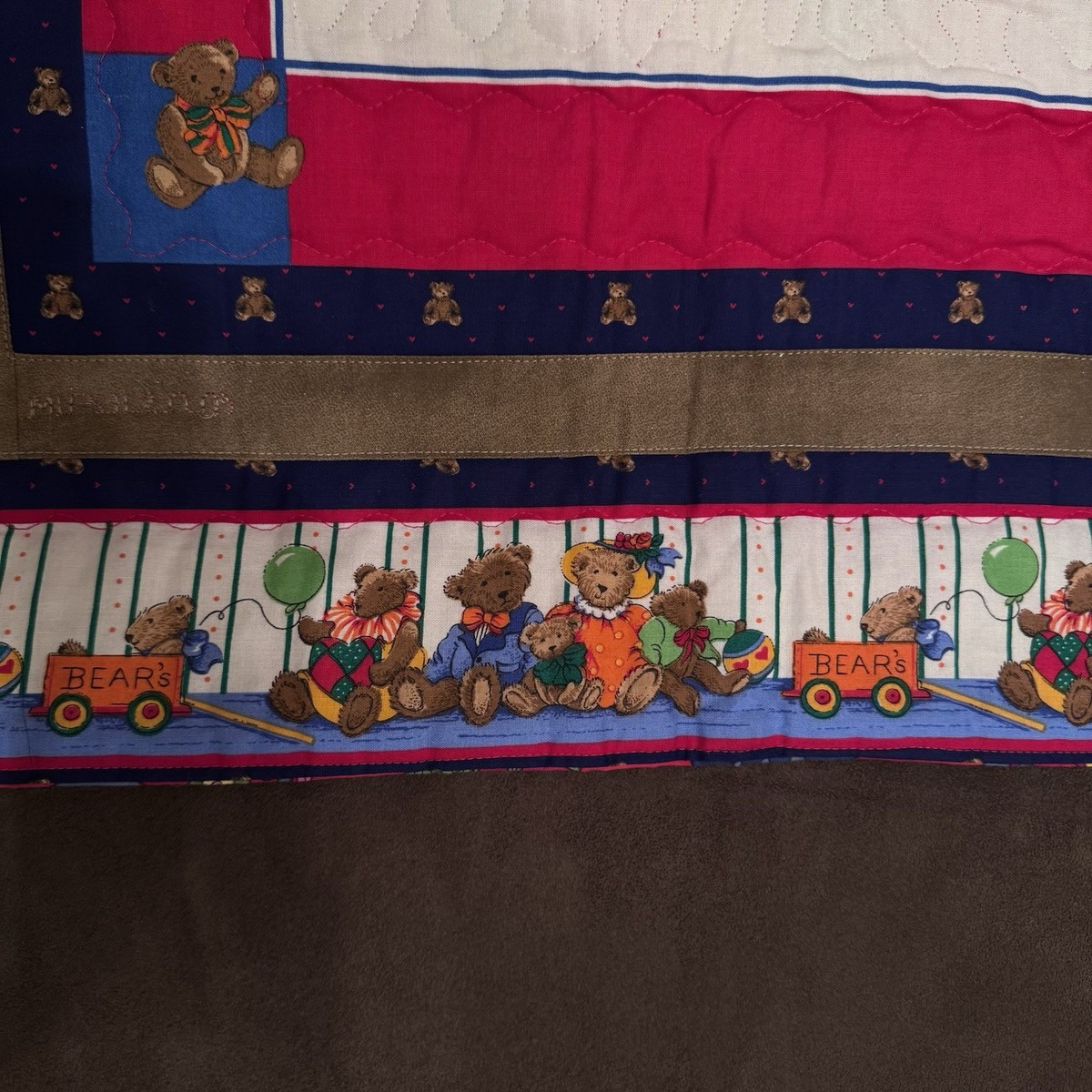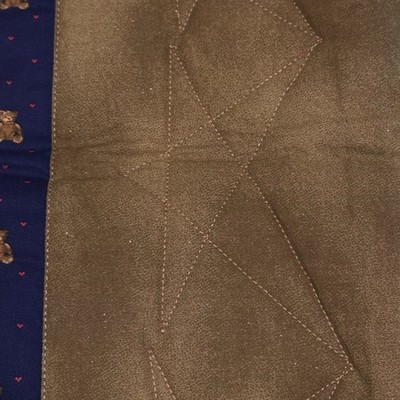 One side features Cranston VIP Bears patchwork. There is a teddy bear border on both top and bottom edges as well. The brown fabric has a star design as you can see in one of the pictures. This fabric is a little bit sparkly. If you do a close up of the picture you will see some little sparks, which adds to the beauty of this quilt.