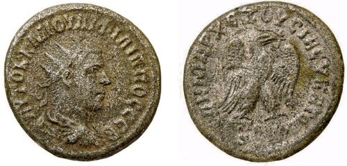 Reverse: ?HMAPX ??OVCIAC V?ATO ?, ANTIOXIA / SC, eagle standing right, holding wreath in beak, with wings spread.