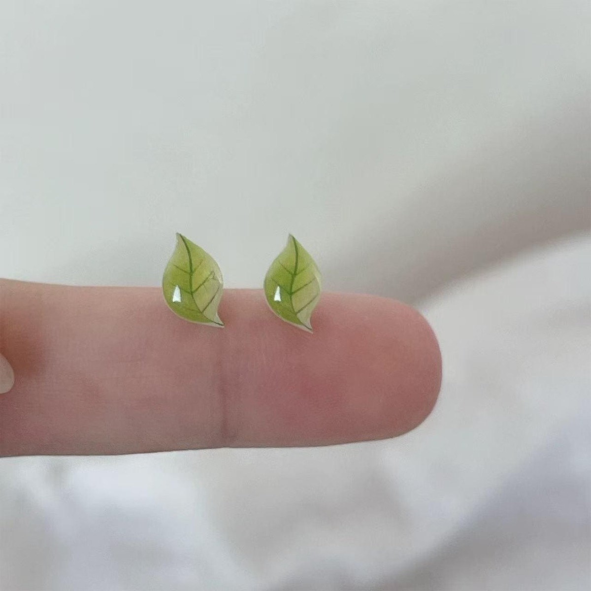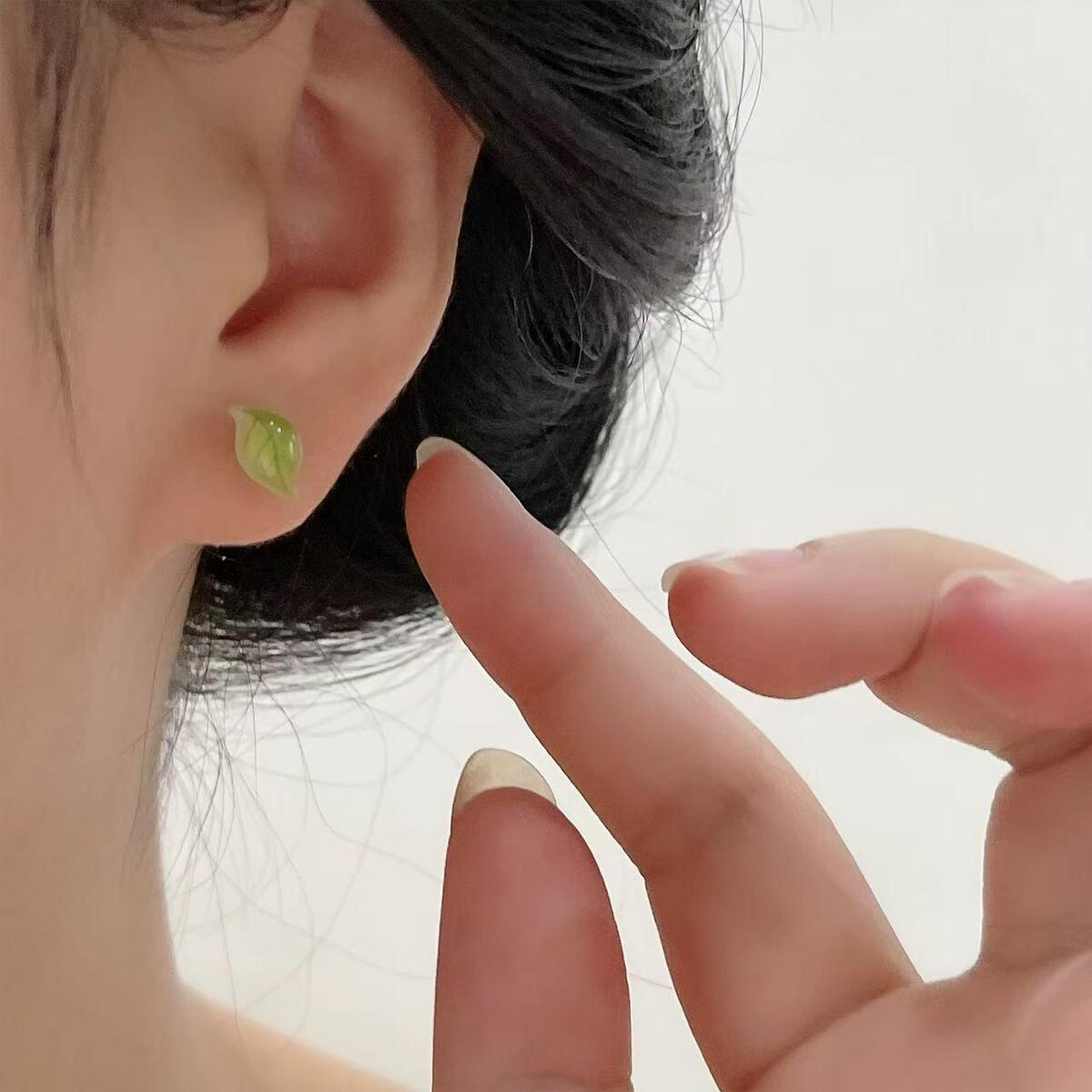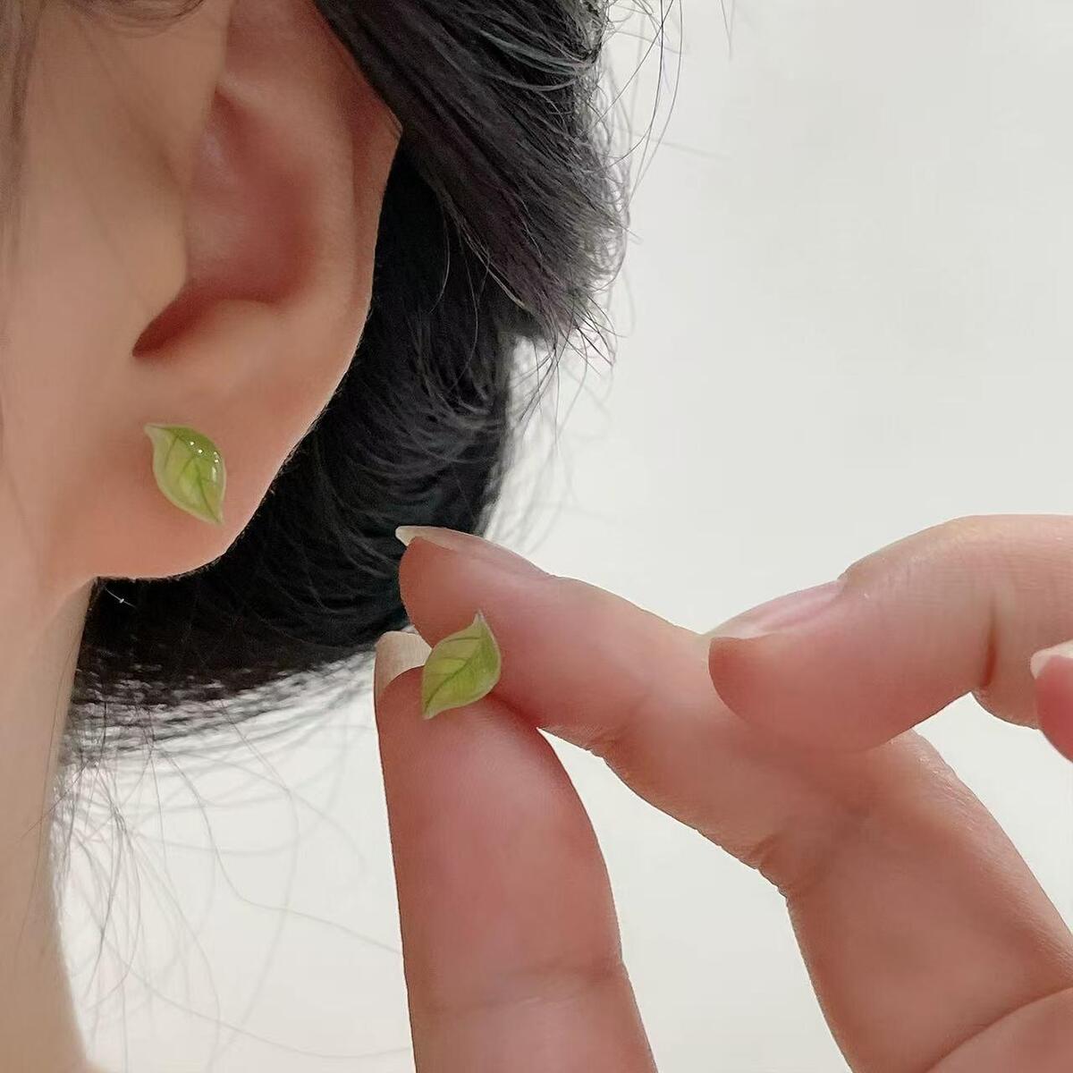This is a 925 sterling silver small fresh green leaf minimalist stud earring. Designed with a simulated leaf shape, the earring features clear leaf veins and natural luster. Its overall style is fresh and forest-inspired, suitable for daily wear or pairing with bohemian-style clothing. The earring has a compact size (approximately 1430mm) and feels lightweight and comfortable when worn. It can serve as a daily accent or a thoughtful gift for friends and family. The design integrates natural elements with modern minimalist aesthetics, showcasing the wearer's fresh and elegant demeanor.