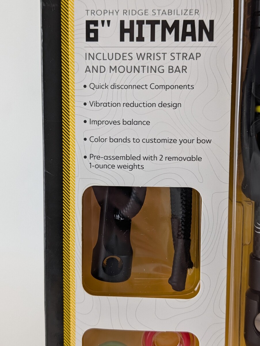 THE ALL-NEW TROPHY RIDGE HITMAN STABILIZER REDUCES NOISE AND VIBRATION WHILE IMPROVING YOUR BOW?S BALANCE WHILE HOLDING AT FULL DRAW. With multiple color kit options. The Hitman features the quick disconnect system of the Trophy Ridge stabilizers with a target carbon design.