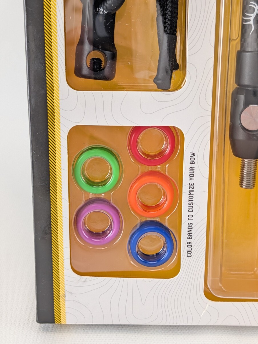 Includes wrist strap, mounting bar, and colored rings for bow personalization