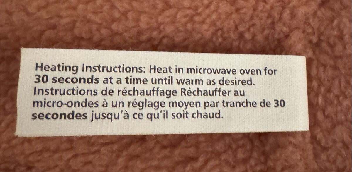 Heating Instructions: Heat in microwave oven for 30 seconds at a time until warm as desired.