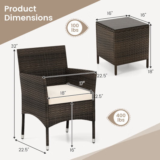 3 Pieces Outdoor Conversation Set with Cushioned Seat and Glass Tabletop-Beige - Color: Beige