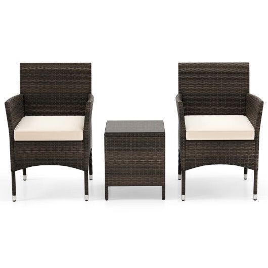3 Pieces Outdoor Conversation Set with Cushioned Seat and Glass Tabletop-Beige -