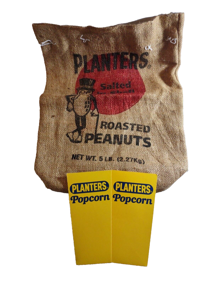 This vintage burlap bag features the iconic Planters . Peanut and is perfect for any collector of advertising or nut-related memorabilia. The bag measures 5 pounds and also comes with a popcorn holder. The brown and yellow colors add a classic touch to any display. The bag was created in 1970 and is an original, making it a unique addition to any collection. The country/region of manufacture is unknown, adding to the mystery and intrigue of the item. Overall, this is a must-have for any fan of Planters Nuts or vintage advertising.