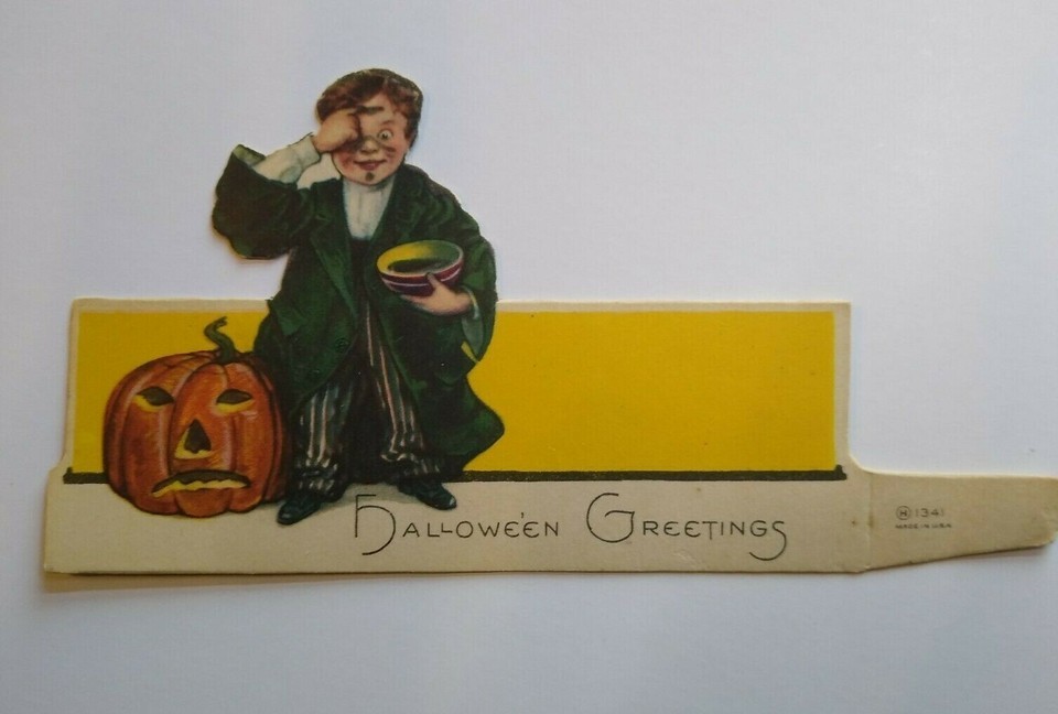 Original Nash Halloween party die-cut place card. The artwork on this place card is similar to a Nash Halloween postcard I have for sale. It is not a handmade item. There is a difference as there is a tab on right side with small "H" in circle and 1341 next to it. The right side is made to fold back so the item can stand. Has creases to the tab on right, light spotting and edge wear. Size is 5.5" wide x 3" tall. Stock #338.