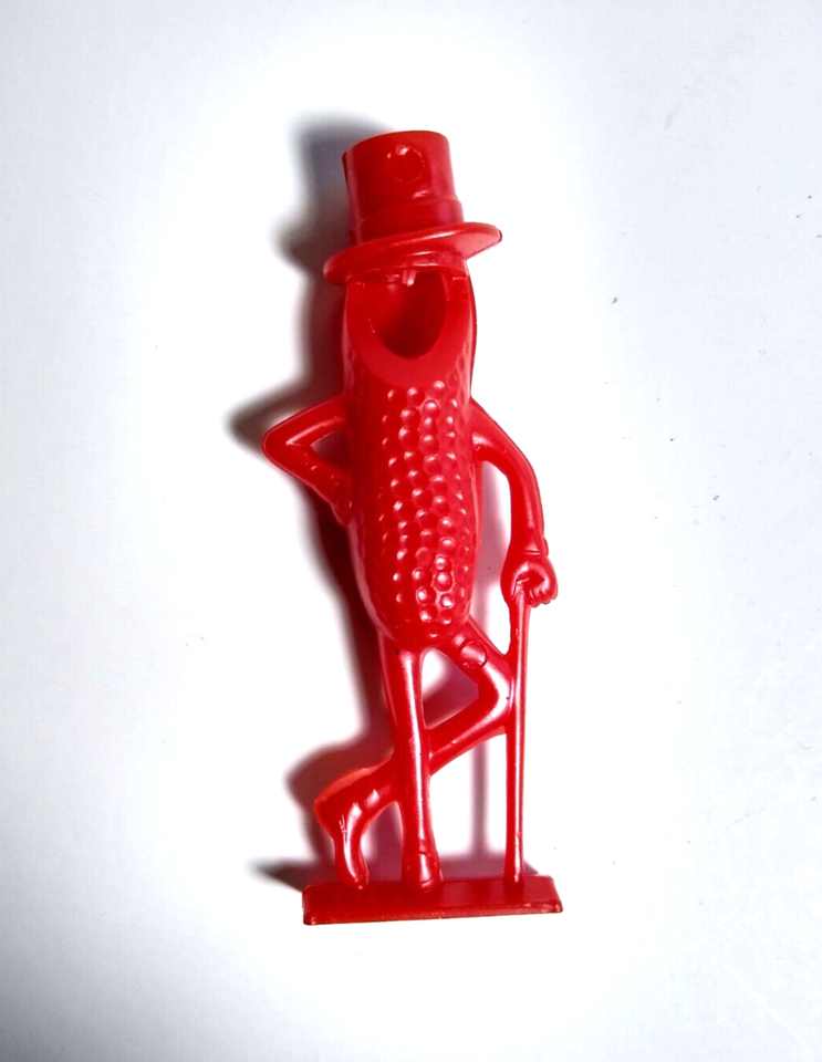 Unused old stock. Original Planters Peanut red color promo figure plastic toy whistle. Has great embossed details. Excellent vintage condition. Size is 2.5" tall.
