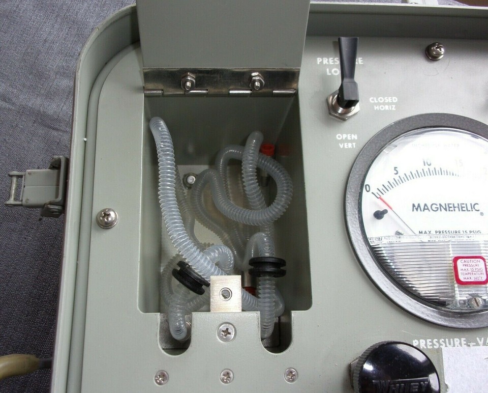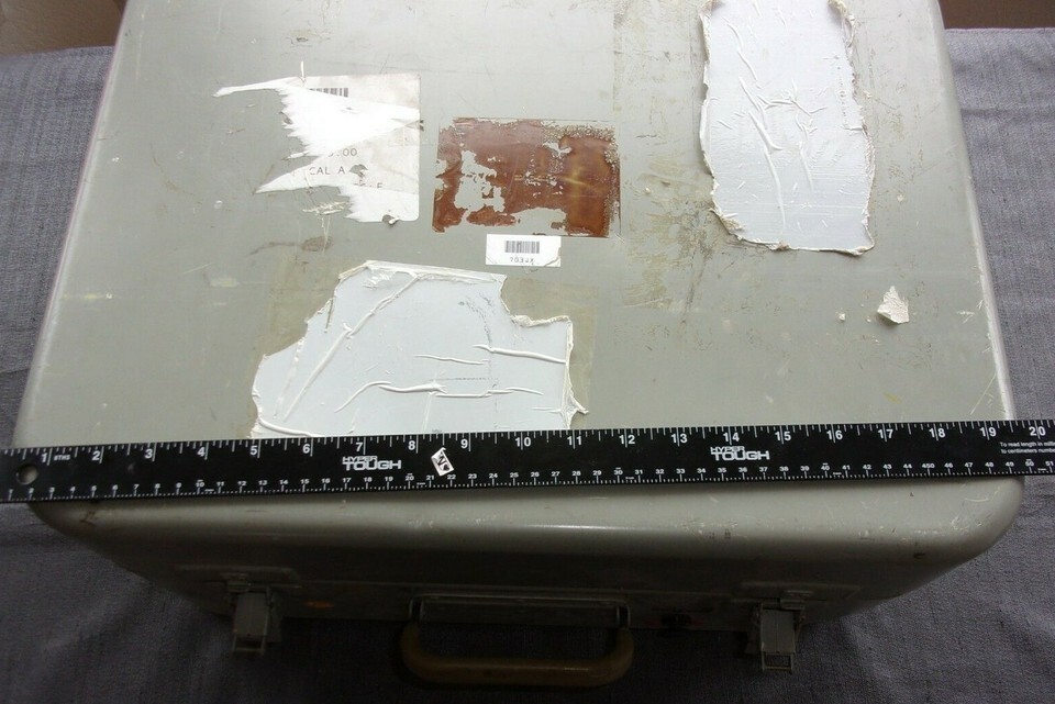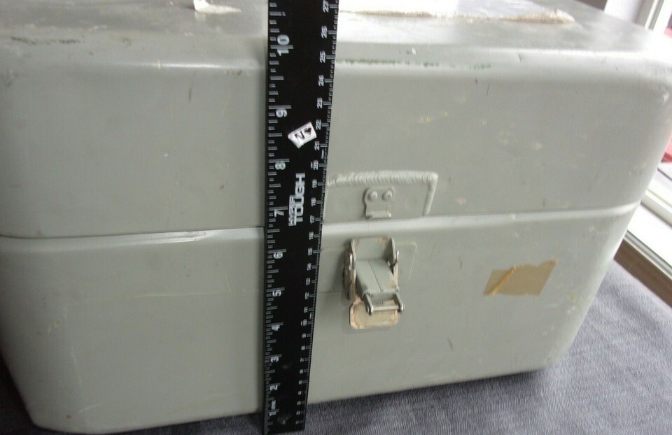 MILITARY EQUIPMENT GRAY METAL SECURING CASE W/ MEASURING DATA AND FIELD METRICS