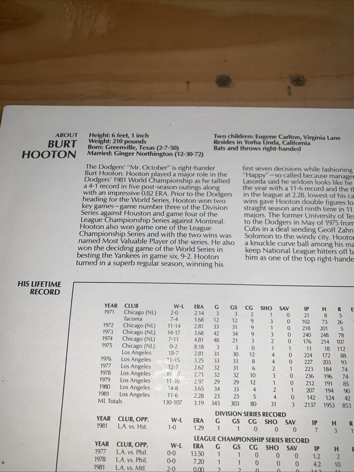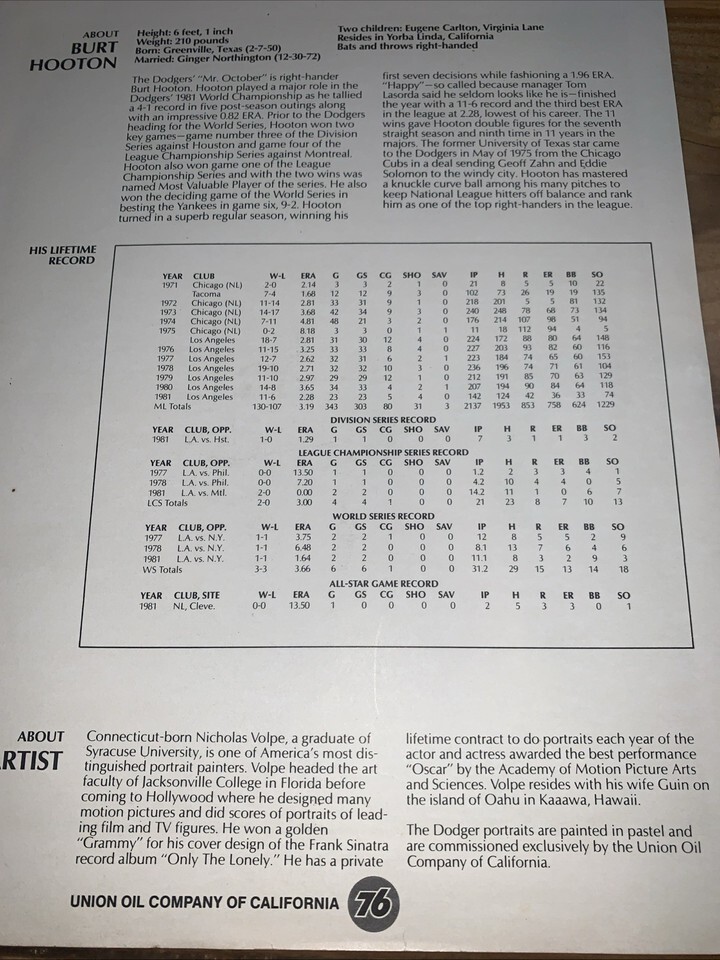 Dodgers/Union 76 Oil Print 1982 : Burt Hooton , Preowned No Damage