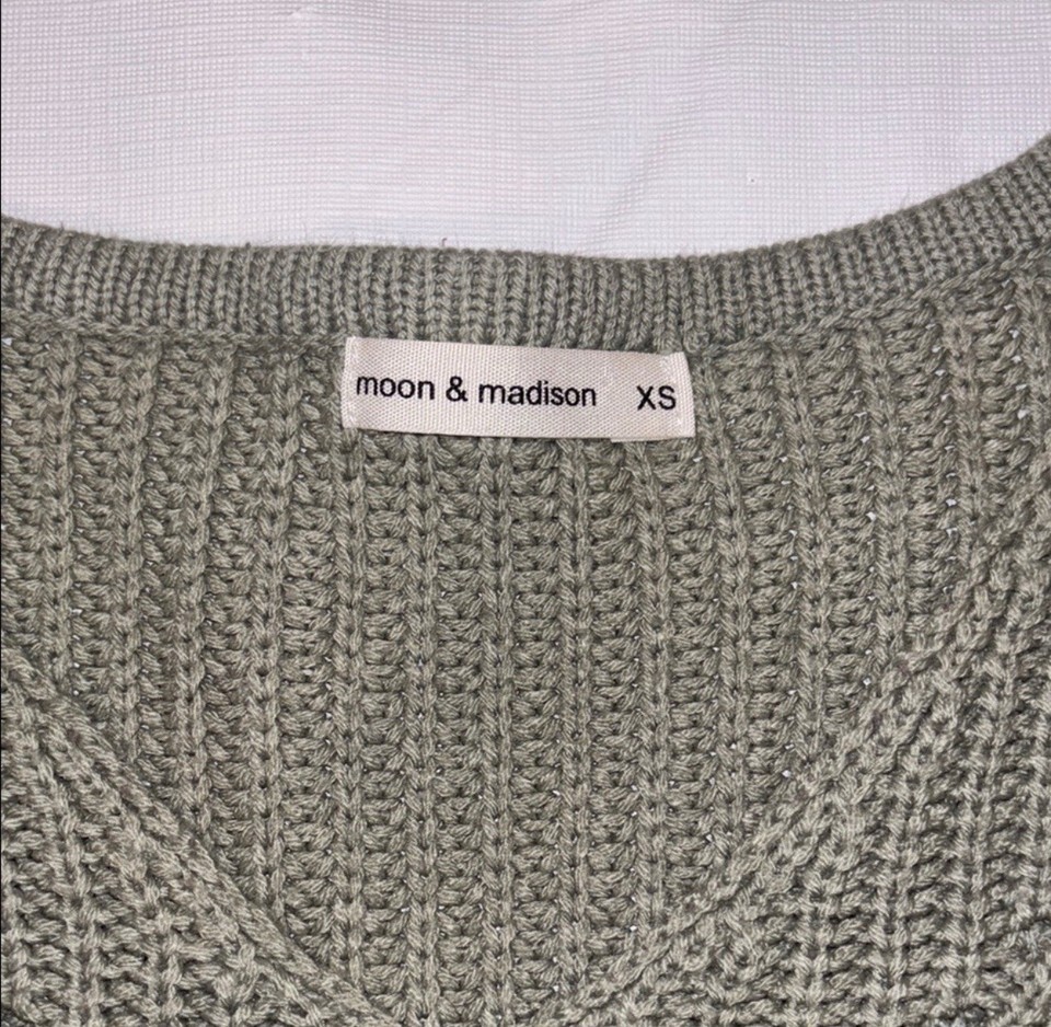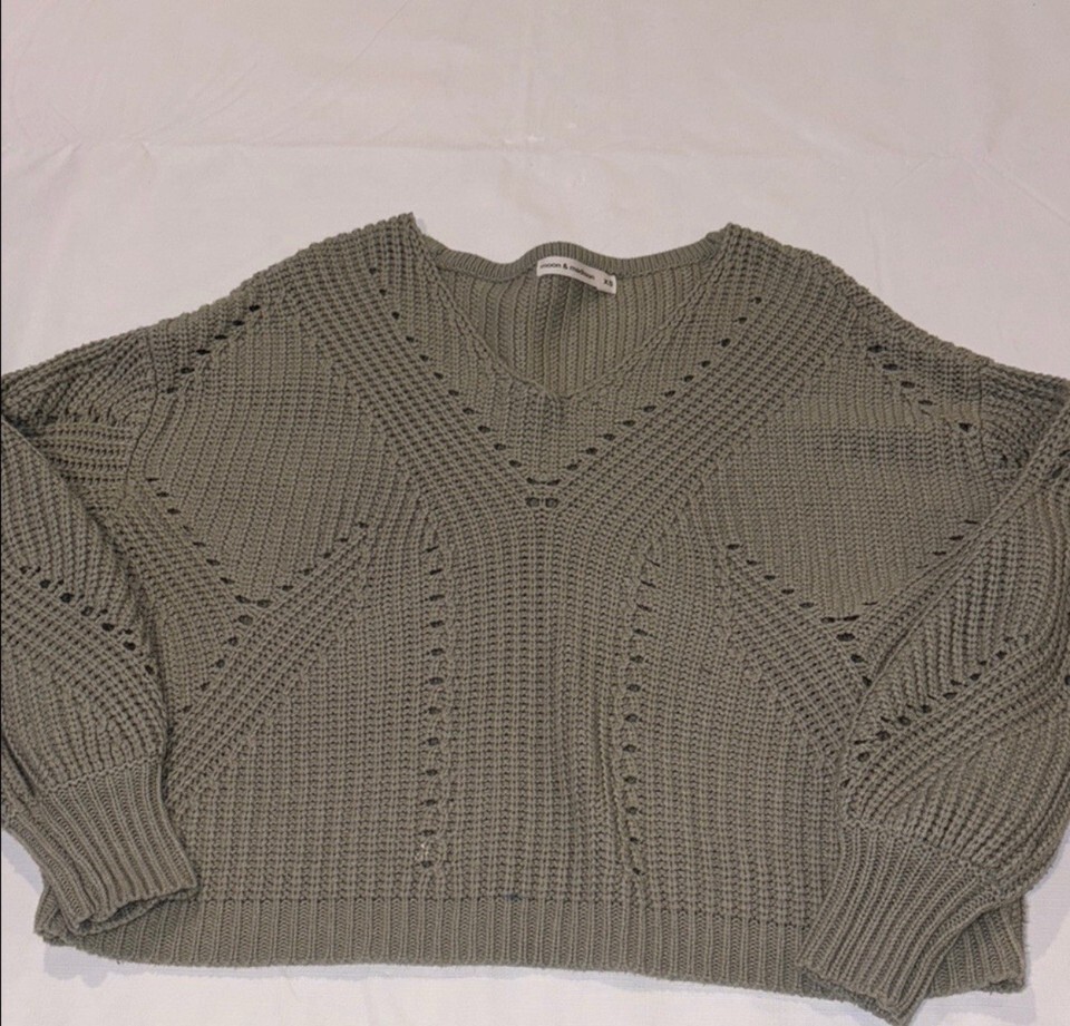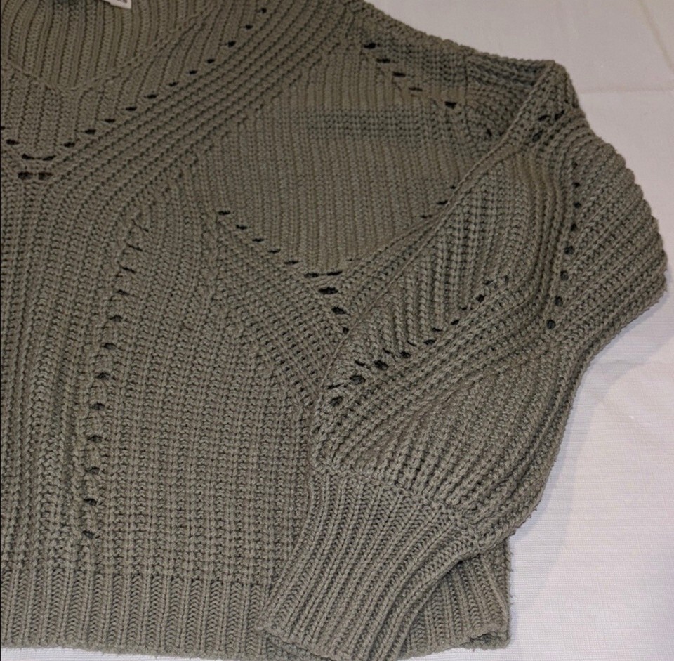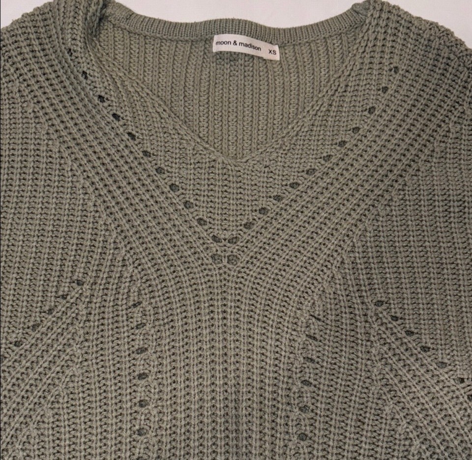 Moon & Madison Sage Green Open Stitch Chunky Knit V-Neck Sweater Women's Size XS