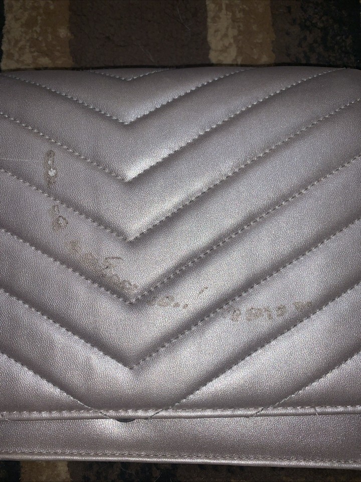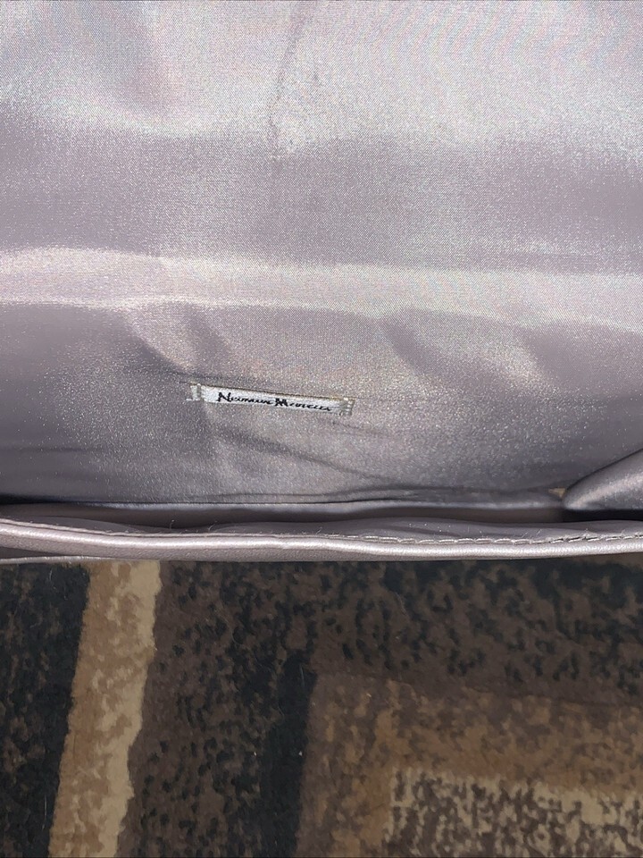 Damage on front of the bag. Could be covered with something. The Women's Neiman Marcus faux leather quilted clutch in champagne is a stylish and elegant accessory perfect for any evening out. The champagne gold color and quilted finish add a touch of sophistication to any outfit, making it a chic choice for women looking to add a pop of luxury to their ensemble. Made from faux leather, this clutch offers a cruelty-free alternative while still maintaining a high-quality look and feel. Perfect for carrying essentials in a convenient and fashionable manner, this clutch is a versatile and timeless addition to any wardrobe.