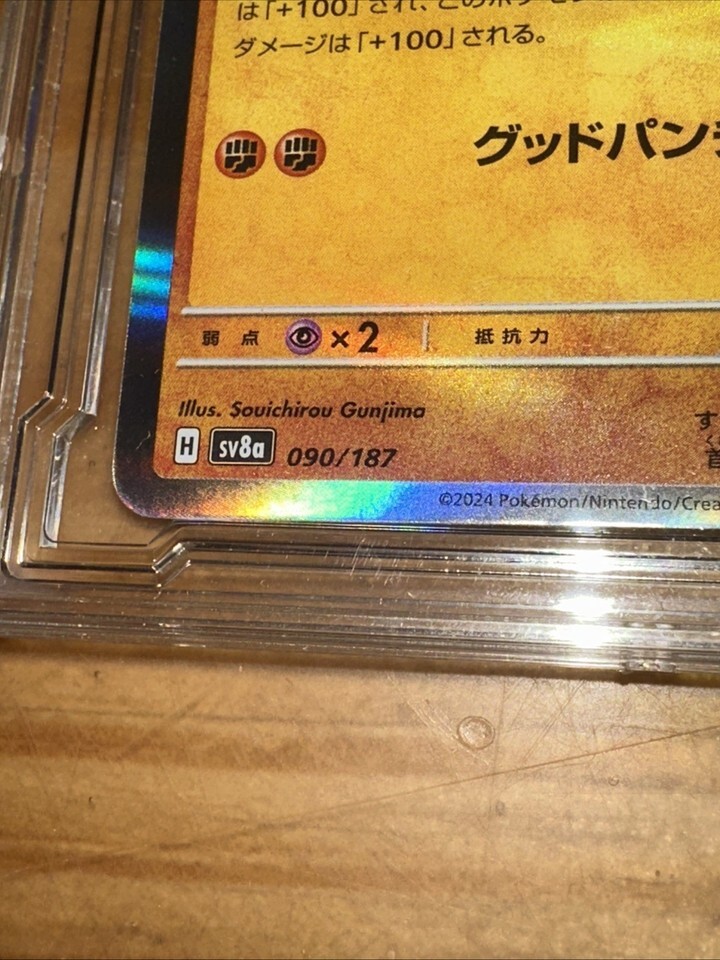 The product is a Pokemon Graded Okidogi #090/187 card from the Terastal Festival in a hard case. It is a Fighting-type card from the Sv8a: Terastal Fest Ex set, featuring the character Okidogi in a Basic stage. The card is made of card stock with a Holo finish, and is part of the Pokemon TCG game. This Japanese-language card is a Legendary rarity and comes in standard size, making it a valuable addition to any collector's portfolio.