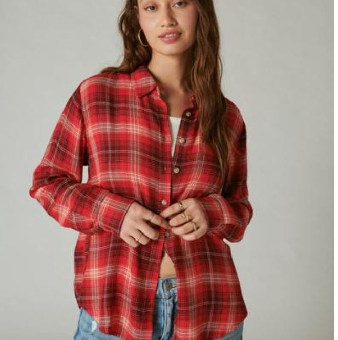 Lucky Brand Women's Cloud Soft Plaid Relaxed Boyfriend Button down Shirt Red S