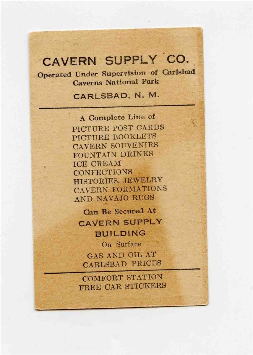 A 2 sided Carlsbad Cavern Supply Co Illustrated Business Card . Has views of underground lunch area on one side and list of items for sale on the other side