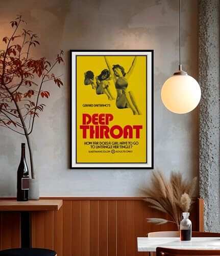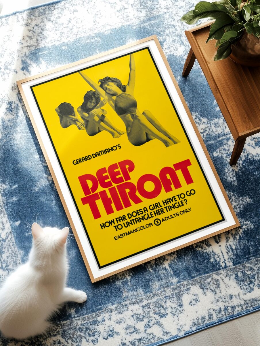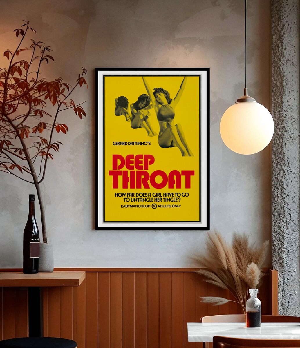Product description: This striking vintage movie poster captures the iconic imagery of Gerard Damiano's groundbreaking 1972 film Deep Throat. Measuring 24 inches by 36 inches, this reproduction poster features the original bold yellow background with dramatic red typography that defined the era's provocative cinema advertising. The retro design showcases classic 1970s graphic style with its distinctive Eastmancolor aesthetic and period-authentic layout. Perfect for collectors of vintage cinema memorabilia, film history enthusiasts, or those seeking authentic retro decor, this wall art piece represents a significant moment in American cultural history. The poster's bold visual composition and nostalgic appeal make it an eye-catching conversation piece for adult spaces, home theaters, or entertainment rooms. This reproduction maintains the original's striking design elements while providing a museum-quality print suitable for framing and display.