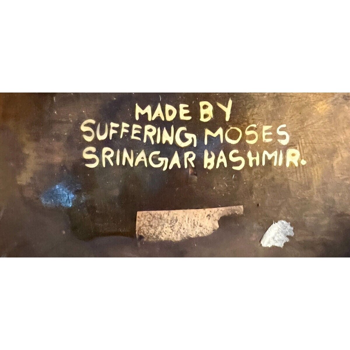 Marked on the underside ?Made by Suffering Moses Srinagar Kashmir.? This mark is associated with a highly regarded Kashmiri artisan known for exceptional hand-painted decorative works produced in Srinagar. While exact dating is not documented, this piece comes from a mid-20th-century estate collection formed during extensive travel in Asia and the Orient in the 1950s. The form, materials, and decoration are consistent with Kashmiri decorative arts traditions of that period. Inner bowl appears to be brass.