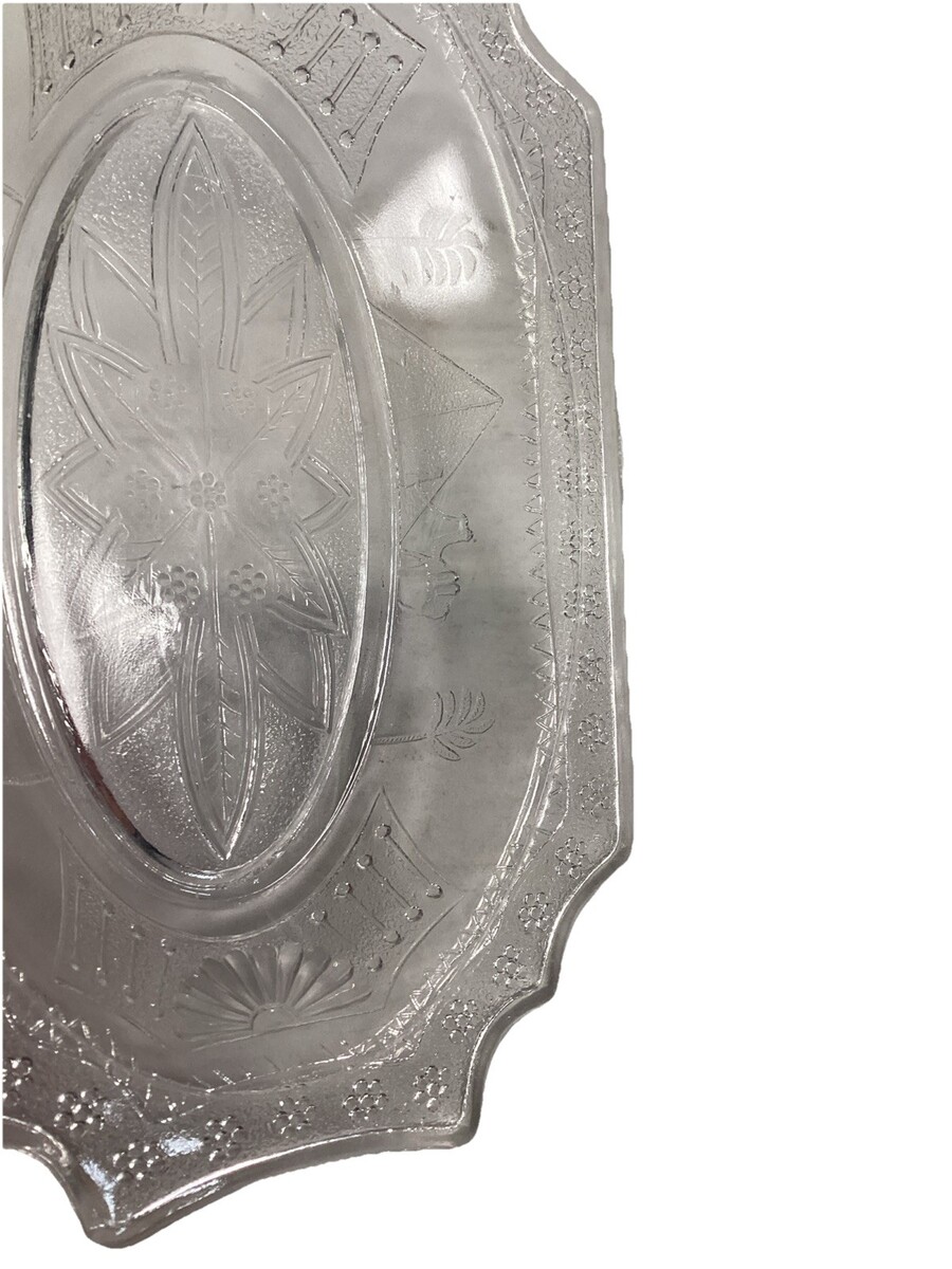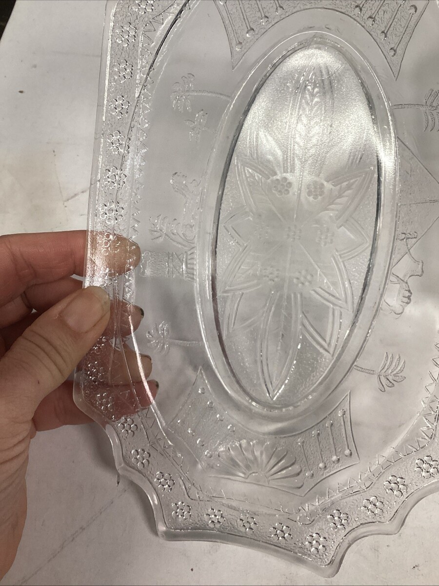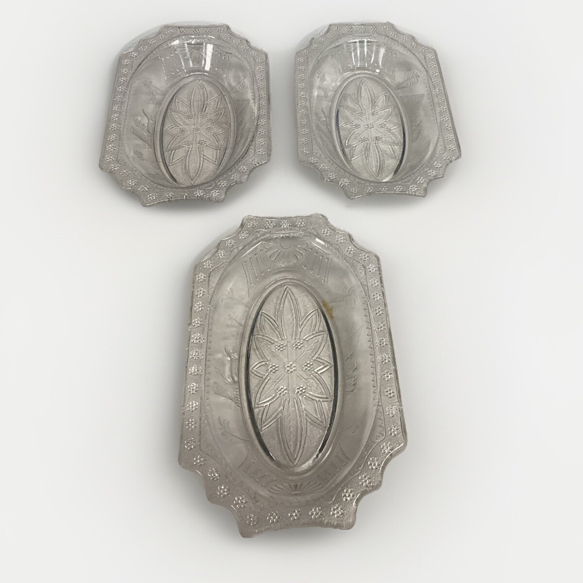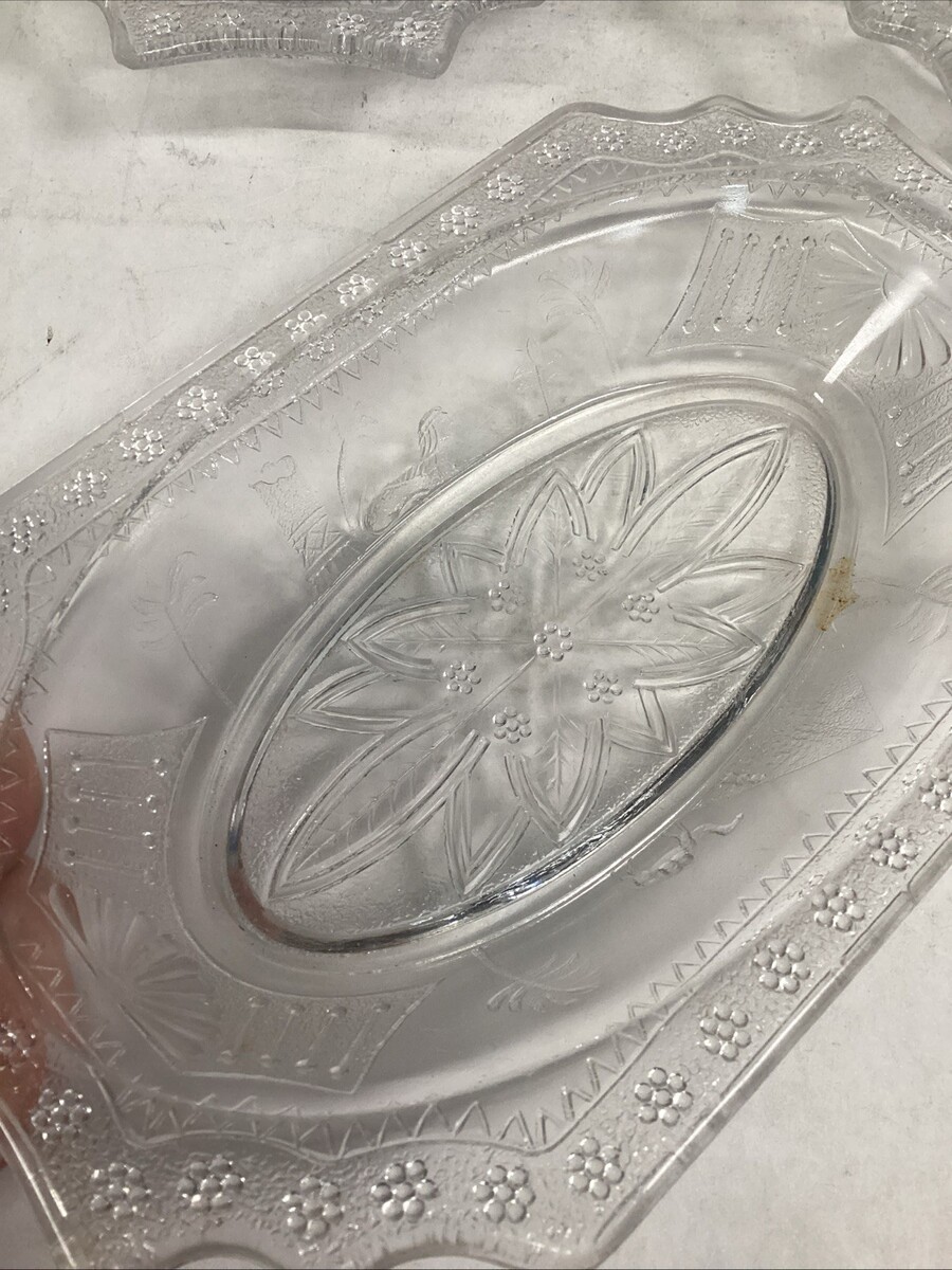 3 EAPG Antique Adams Co 1880?s Egyptian Sphynx Camel Pyramid Motif Candy or Nut Dishes. In good condition. No cracks. They all have a few small chips on the top edge either on the side or underneath the lip. One has a stain on it. These measure 8.5x5.5x1.5?
