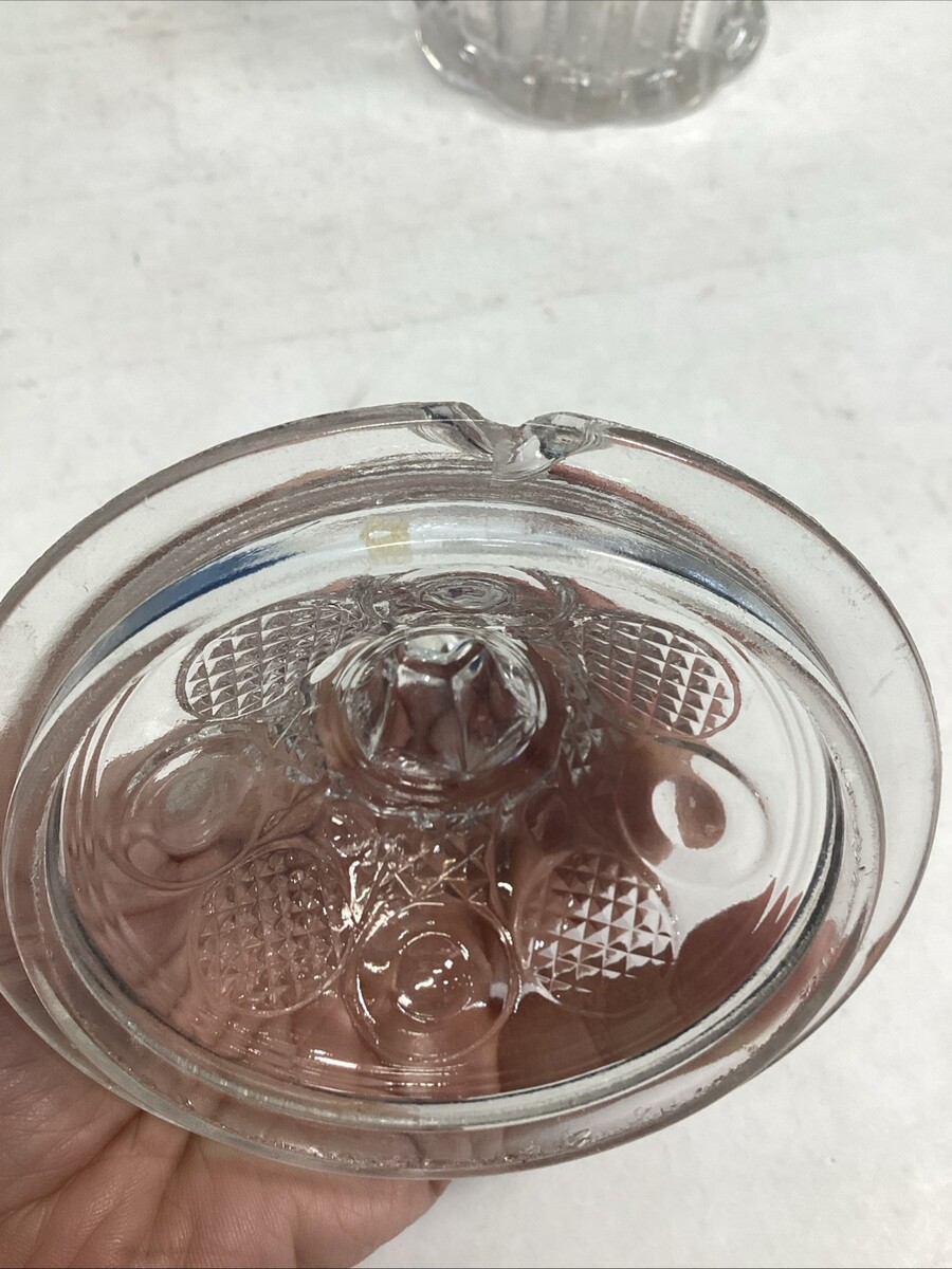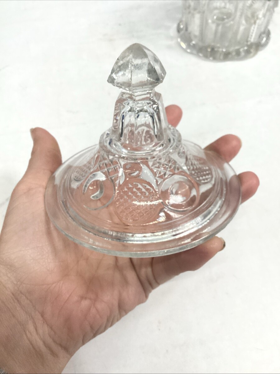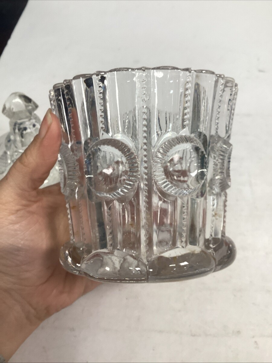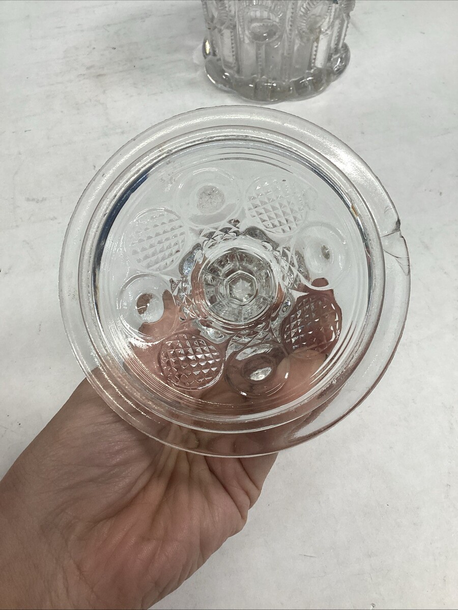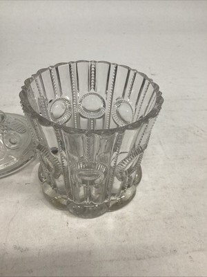 Vintage EAPG Pressed Glass Sugar Bowl With Lid Or Lidded Candy Dish. In mostly good condition. It has some scratches and a stain on the base and the lid has a chip on the edge. This measures 7?H to the top of the lid. Without the lid it?s 4?H and is 4.25?D