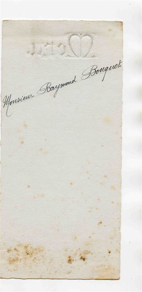 Measures about 3 1/4" x 7" with guest name hand written on the back. An embossed Diner Menu by Jean Laumonier Traiteur Pithiviers. A French Restaurant Menu Card dated September 17, 1938