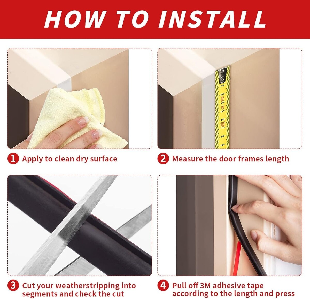 Our super strong self-adhesive weather stripping is incredibly easy to install. Simply tear the red protective film, apply it to the desired area, and wait 24 hours for ultimate adhesion. You can rest assured it will stay put, even in extreme conditions.