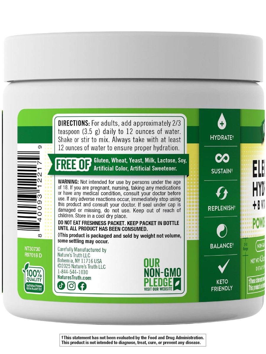 Expiration Date of 8/2026 ? ELECTROLYTE HYDRATION* POWDER: Receive key electrolytes, minerals vitamins in one formula ? VEGAN POWDER: Lemon-flavored powder, mix with at least 12 ounces of water ? HONEST TRANSPARENT: Nature?s Truth is committed to delivering the best quality wellness products ? EXPERTS YOU CAN TRUST: Backed by three generations of Vitamin Innovators for unrivaled quality ? NATURALLY FREE OF: Gluten, Wheat, Milk, Lactose, Soy, Artificial Sweetener Color, and Non-GMO