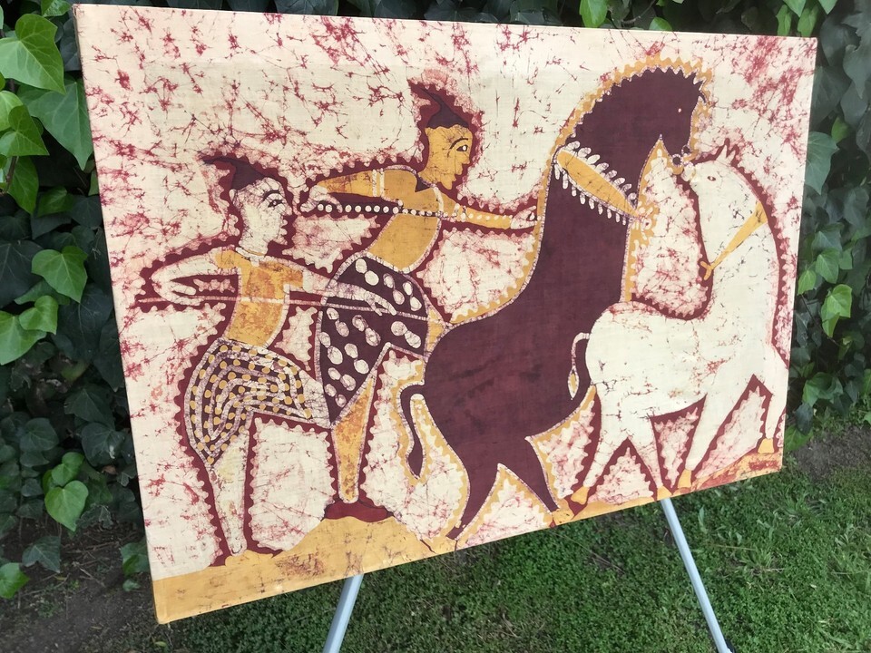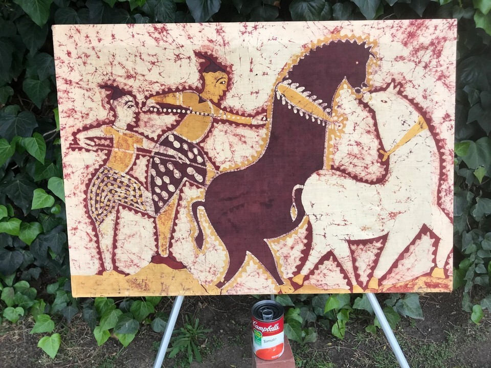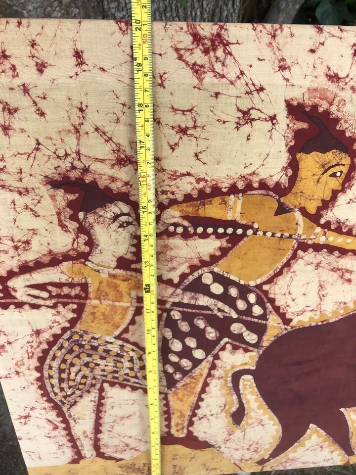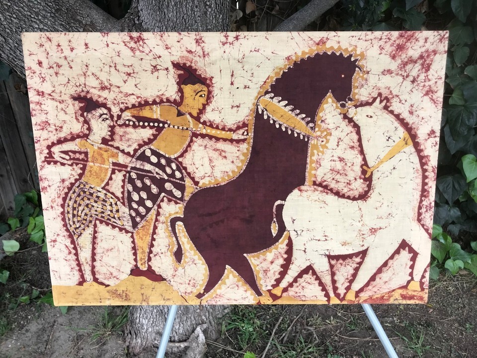 VINTAGE BALI BATIK Original MODERN PRIMITIVE Men Horse Cave Art Fabric Painting