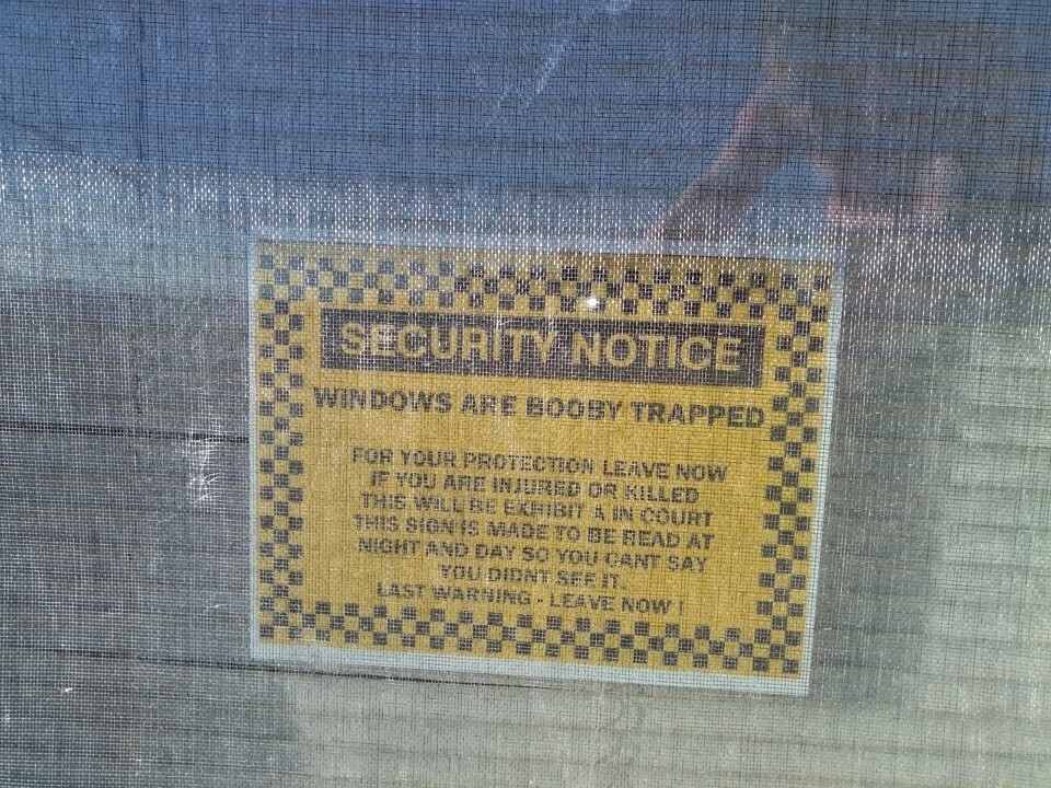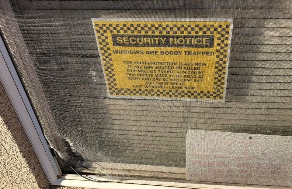 WARNING SIGN HOME SECURITY SYSTEM THIS WILL BE EXIBIT A IN COURT THIS WINDOW IS PROTECTED