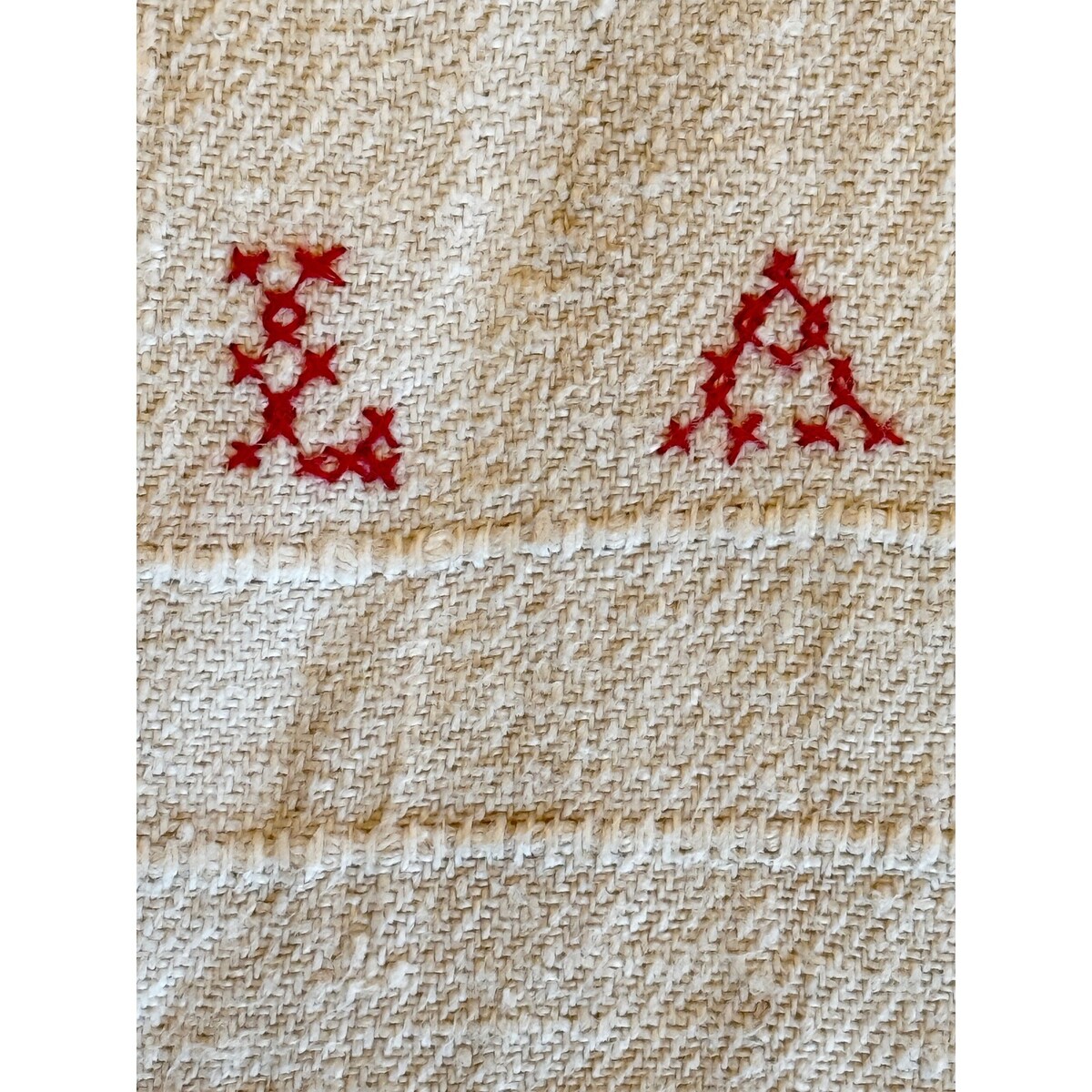 Antique 1830s?1840s Hand Woven Linen Wash Stand Show Towel with red signed L.A. It is in the style of a sampler and in great condition, stored in a cedar chest for the last almost 200 years. App. 62" long without the fringes and 26" wide. In very good condition. The linen is quite heavy.