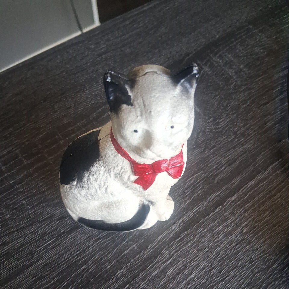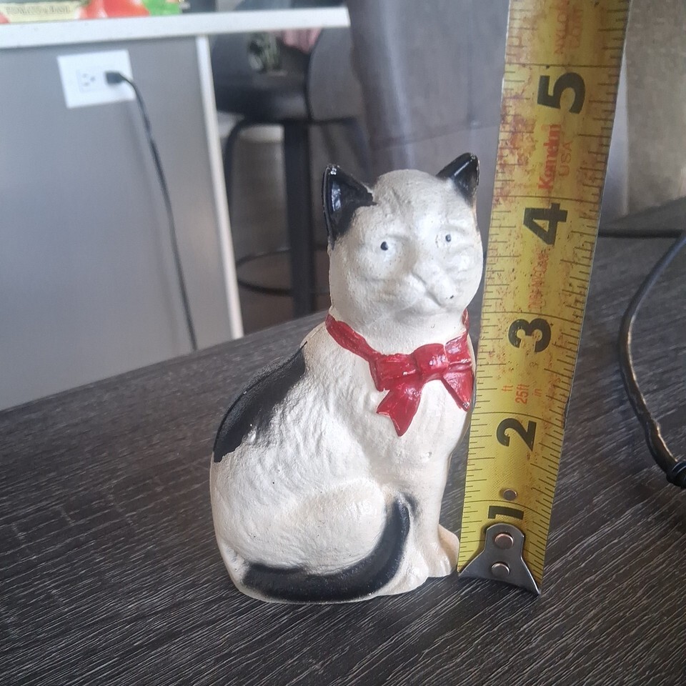 This product is a vintage new antique painted cast iron metal cat with a red bow, functioning as both a bank and a doorstop. The 4" figure is intricately designed and adds a touch of charm to any room. Made of durable cast iron, this unique piece combines functionality with a whimsical animal theme, making it a desirable collectible for cat lovers and antique enthusiasts alike. Its two-in-one design makes it a versatile addition to any home decor.