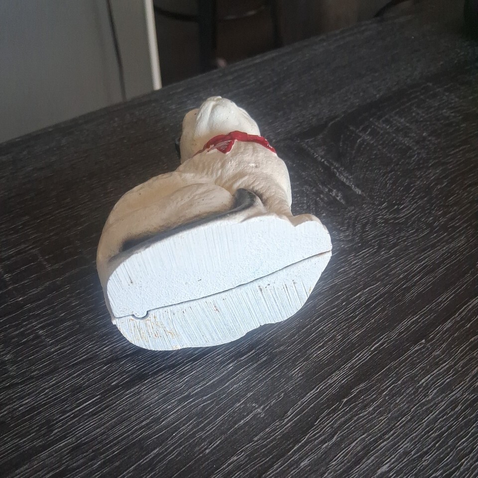 Vtg Antique Painted Cast Iron Metal Cat with Red Bow Bank/Doorstop 4” Figure