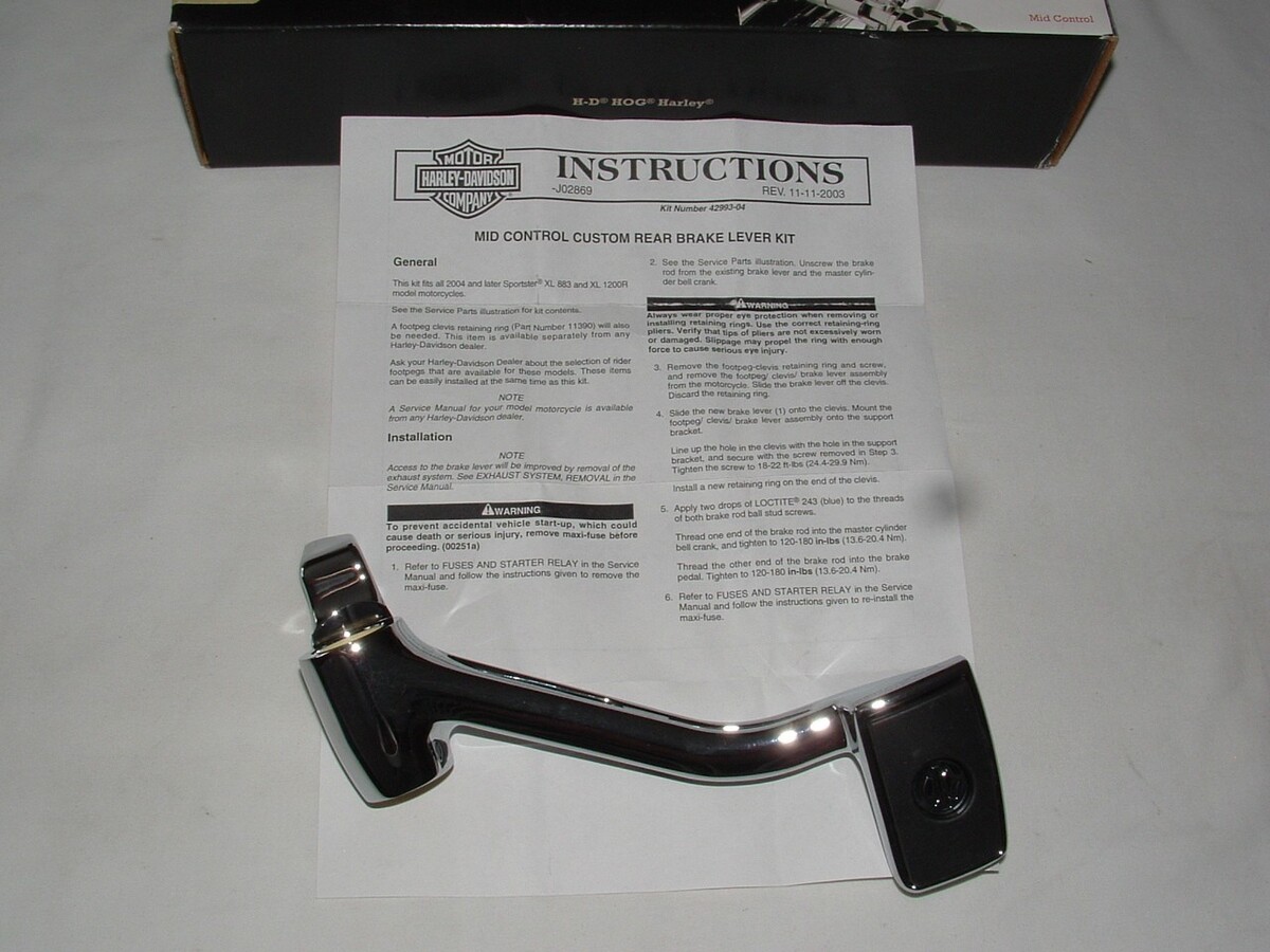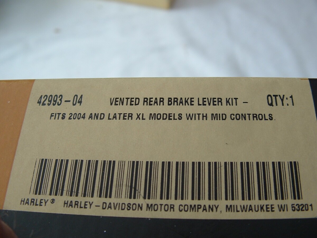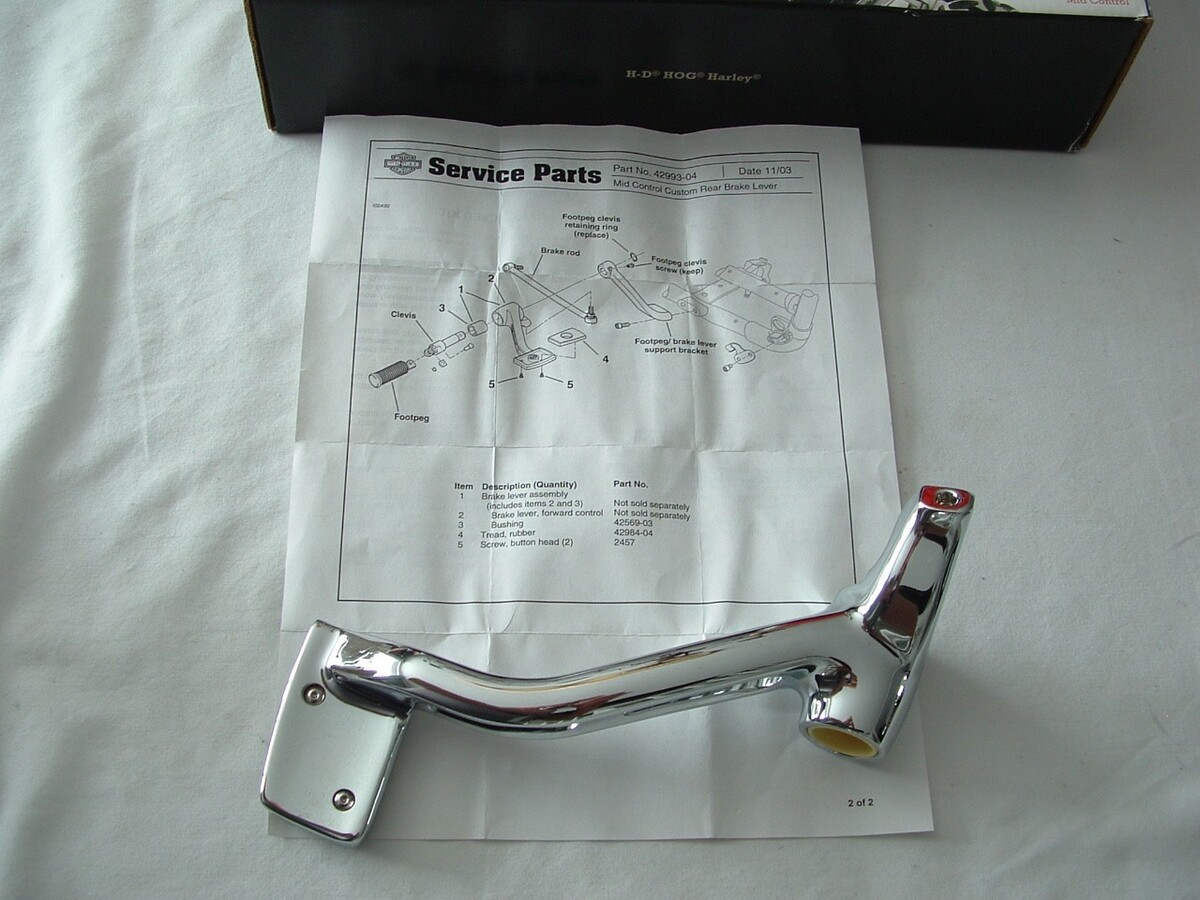 Genuine Harley Davidson CHROME Vented rear Brake Lever and Chrome Brake rod. Part number 42993-04 is the brake lever. Part number 34697-04 is the brake rod. These parts are mid controls.