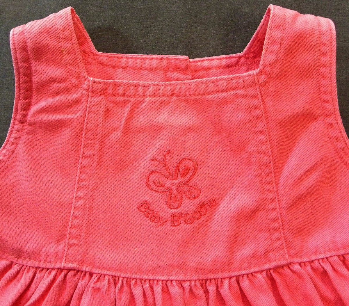 This sale is for a preowned Vintage Osh kosh B'Gosh Sundress in size Baby girls 12 months a this sleeveless dress is a coral-shell pink cotton twill. Fabric: This dress is sturdy 100% cotton Twill. It features: back buttons the whole length of the back, an embroidered butterfly on the chest, Baby B'Gosh Logo embroidered on the chest. Measurements across the waist: 21" ~~ top shoulder to hemline edge: 14.5".